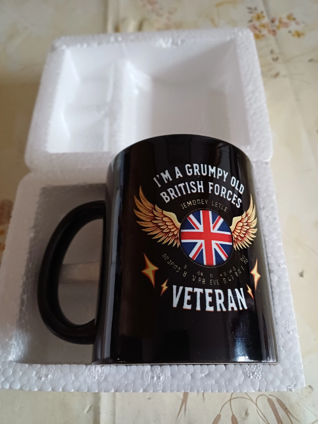 243 reviewsI'm selling a mug that says "I'm a grumpy old British forces veteran". It is black with the British flag and comes in its original packaging