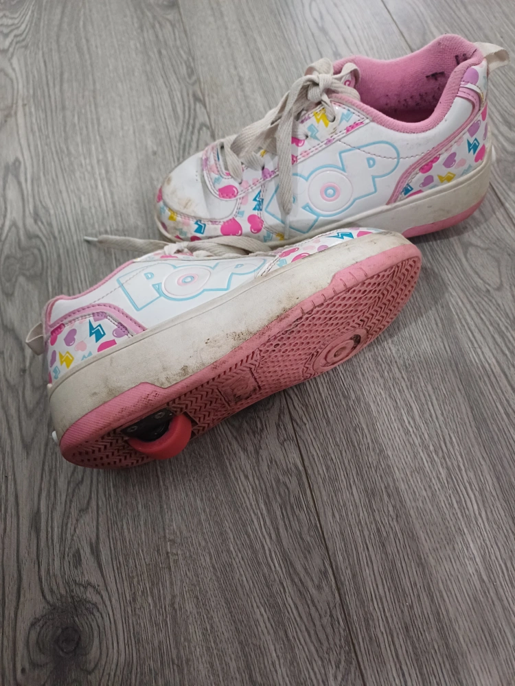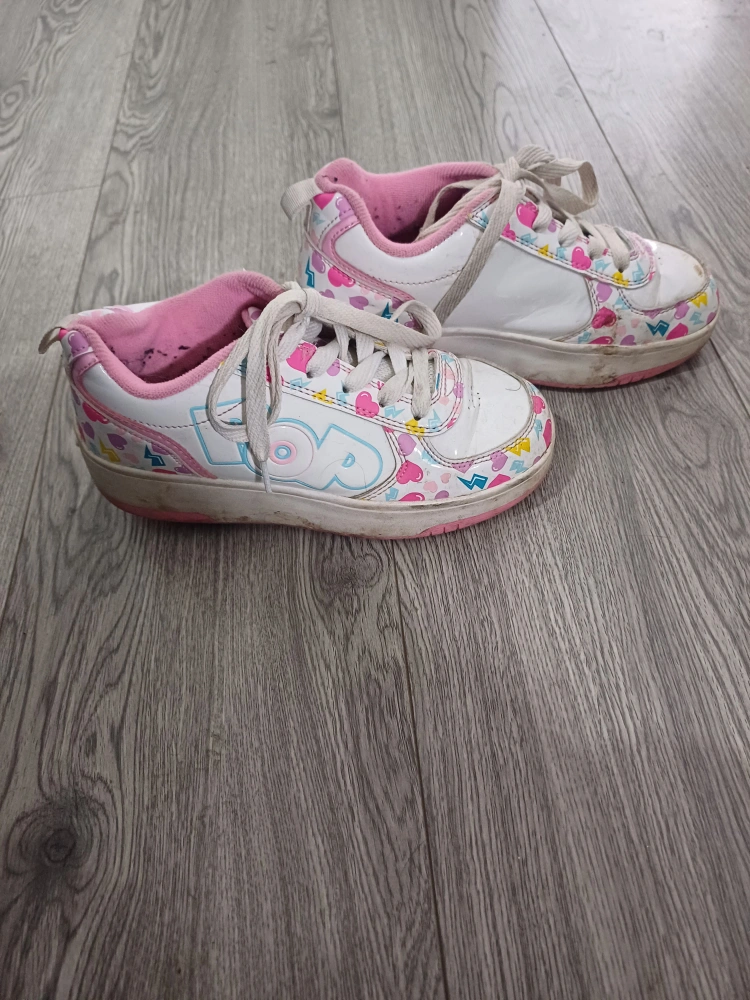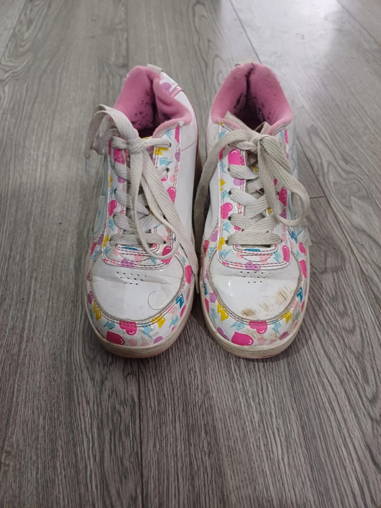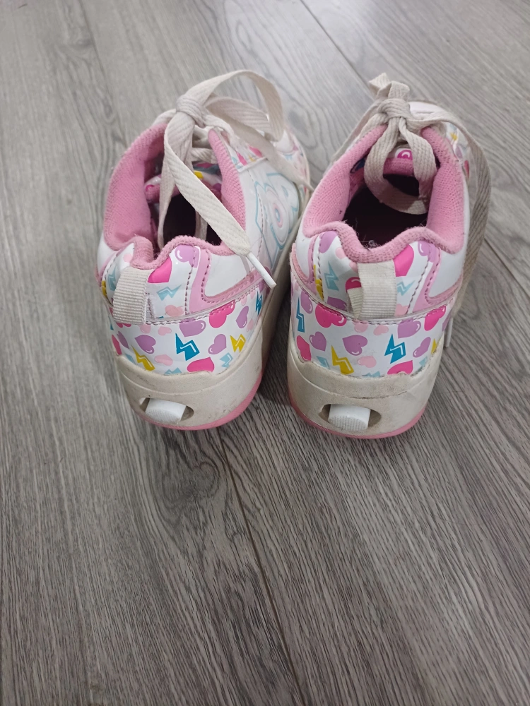 1 reviewHeelys in UK size 2. They're white with a colourful pattern and pink trim. Please note they have some signs of wear, as shown in the photos.