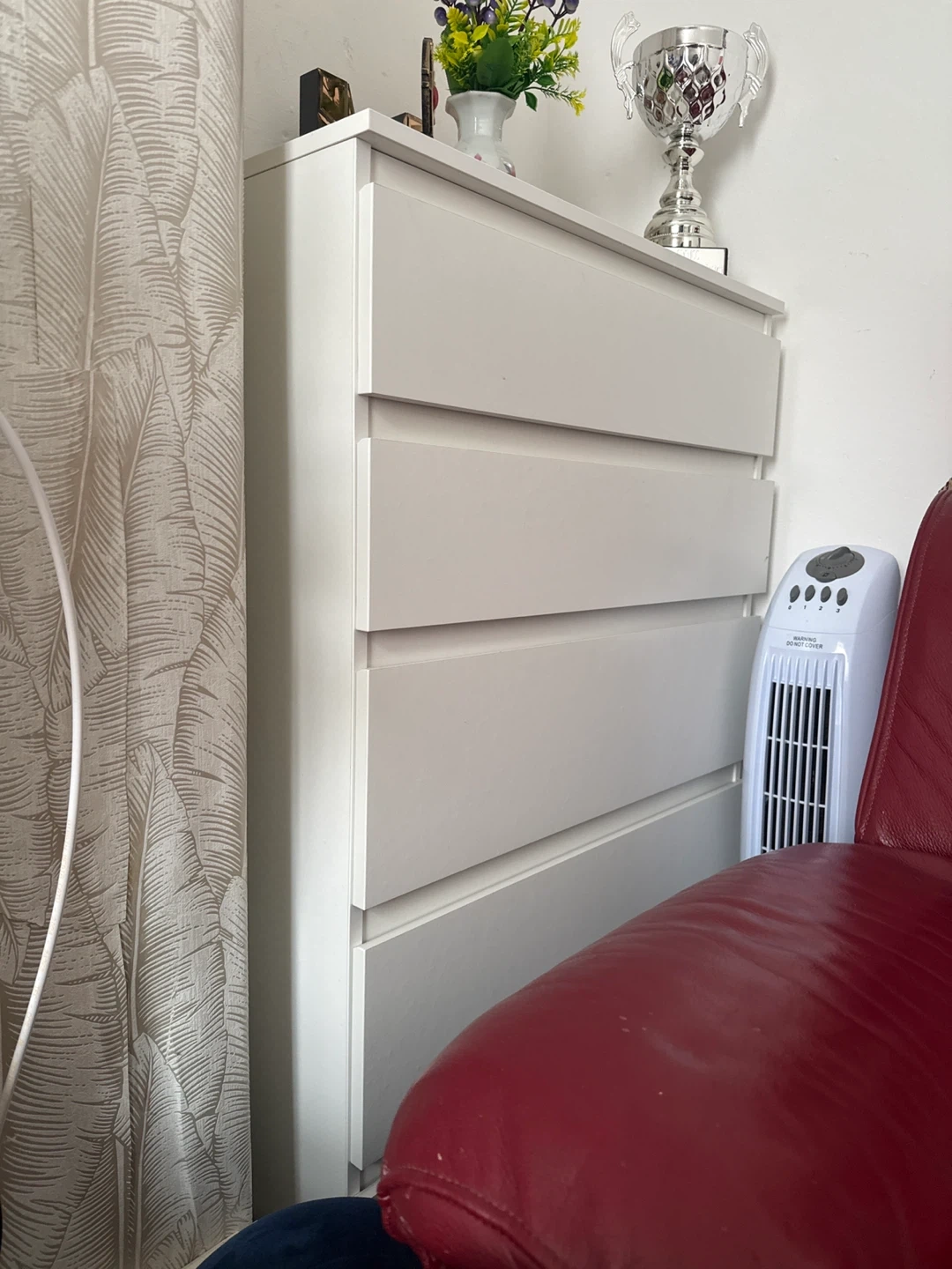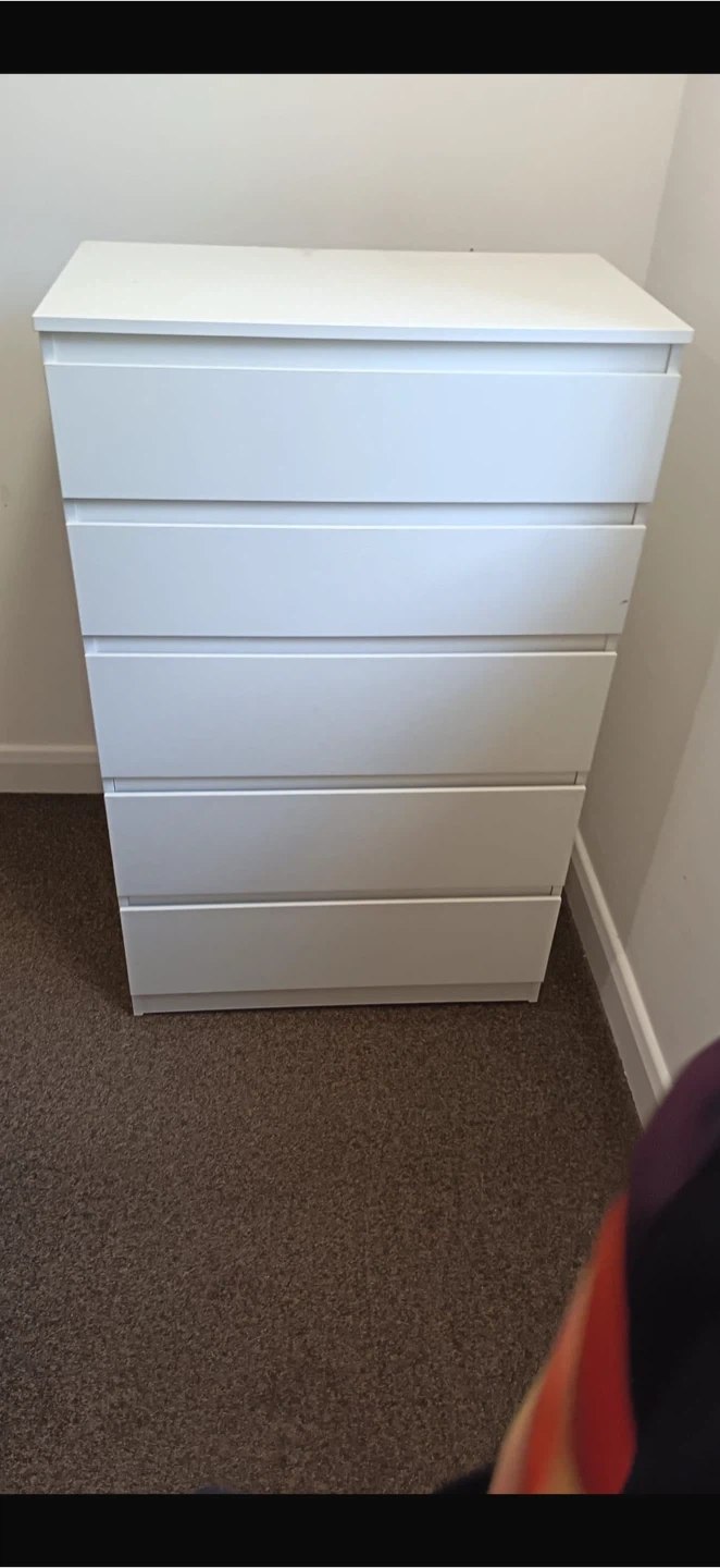 17 reviewsHere's a lovely IKEA Hemnes chest of drawers in white. It features five spacious drawers, perfect for storing clothes or other items. It's a great addition to any bedroom or living space!