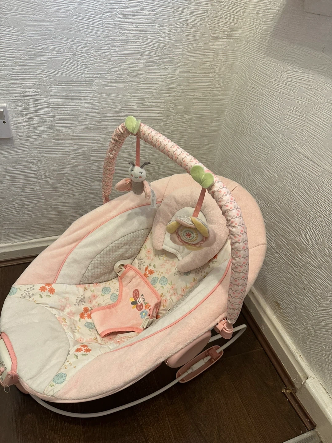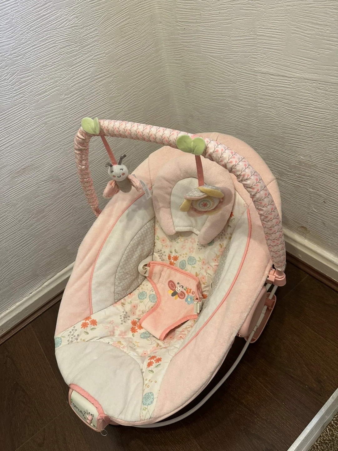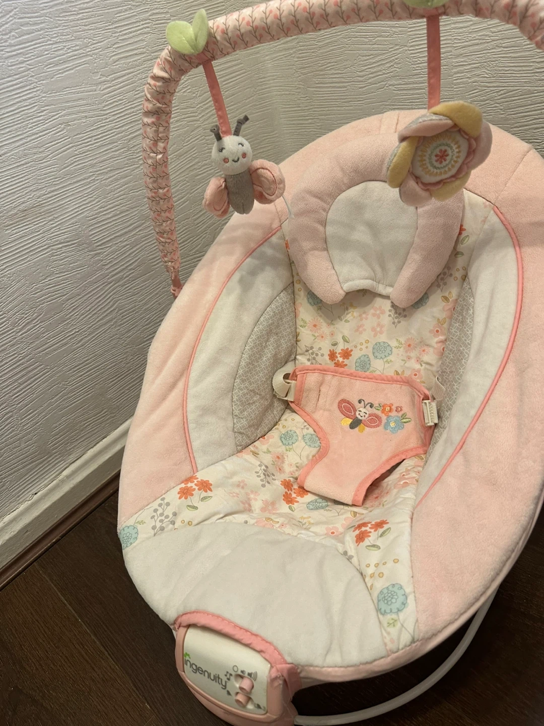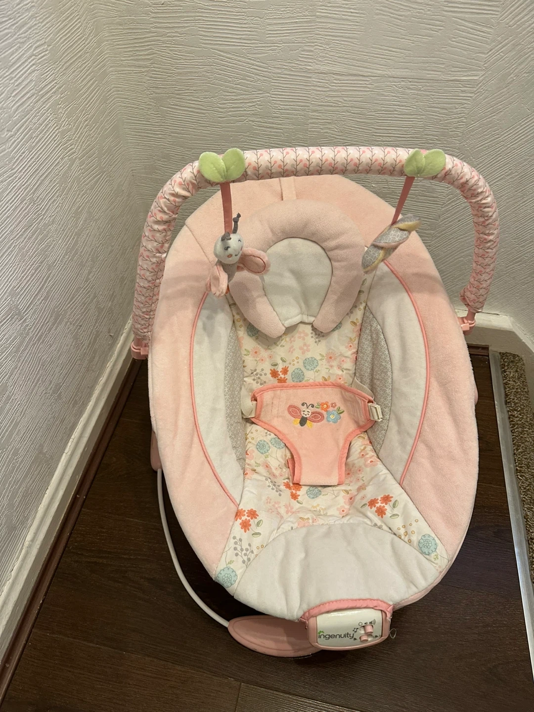 0 reviewsSelling a lovely Ingenuity baby bouncer in a pretty pink floral design. It's in great condition and has a toy bar with hanging toys to keep your little one entertained. Perfect for newborns and up!