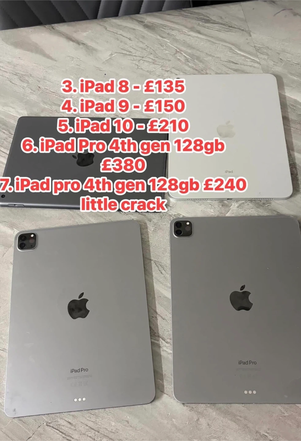 Call 07582969696 for info: *iPhones* 1. iPhone SE 2022 - £125 2. XR 64gb - £105 3. 11 64GB - £140 4. 12 Mini - £145 5. 12 64GB - £160 6. 12 Pro - £190 7. 12 Pro Max - £250 8. 13 128gb - £205-£235 9. 13 Mini 128gb - £220 10. 13 Pro 128GB - £275, 256gb £310 11. 13 Pro Max 128GB - £315 12. 13 Pro Max 256GB - £340, 512gb £355 13. 14 128GB - £265 14. 14 Plus - £280 15. 14 Pro - £320 16. 14 Pro Max 128GB - £385 17. 14 Pro Max 256GB - £420 18. 15 Pro 128GB - £460 19. 15 Pro Max 256GB - £500 20. 15 Plus 128gb - £400 21. 15 128GB - £350 22. 16 - £490 23. 16 Plus - £500 24. 16 Pro 128GB - £625 25. 16 Pro Max 256GB - £710 26. 17 - £675 (new) 27. 17 Pro - £1000 28. 17 Pro Max 256gb - £1120, 512gb £1250 *Samsung* 1. S10e 128gb - £100 2. S10 128gb - £115 3. A12 - £75 4. S20 - £130 5. S20 ultra - £180 6. S21 5g 128gb - £140 7. S21 plus 5g 128gb - £175 8. S21 Ultra 128GB - £195 9. S22 - £160 10. S22 Ultra 128GB - £255 11. S22 Ultra 256GB - £285 12. S23 Ultra 256GB - £350, 512gb £390 13. S24 128gb - £250-£280 14. S24 Ultra 256GB - £490, 1TB £530 15. S25 Ultra 256GB - £650 16. Z fold 7 512gb - £1000 17. Note 20 ultra 256gb - £220 18. Note 20 256gb - £130 *Google Pixel* 1. Pixel 9 Pro XL - £470 (new) 2. Pixel 9 - £280 *iPads* 1. iPad 5 - £90 2. iPad 6 - £105 3. iPad 8 - £150 4. iPad 9 - £170 5. iPad 10 - £210 6. iPad Pro 4th gen 128gb £380 *Apple Watch* 1. Apple Watch SE 44mm - £135 *Galaxy Watch* 1. Galaxy Watch 7 (new) - £135