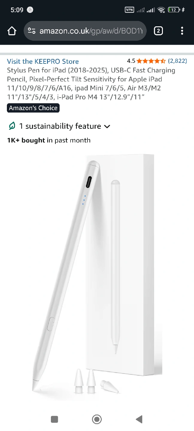 3 reviewsI'm selling a KEEPRO stylus pen for your iPad. It's compatible with a range of iPad models from 2018 to 2025, including iPad 11/10/9/8/7/6/A16, iPad Mini 7/6/5, Air M3/M2 11"/13"/5/4/3, and i-Pad Pro M4 13"/12.9"/11". It features USB-C fast charging and pixel-perfect tilt sensitivity, so it's perfect for drawing and note-taking