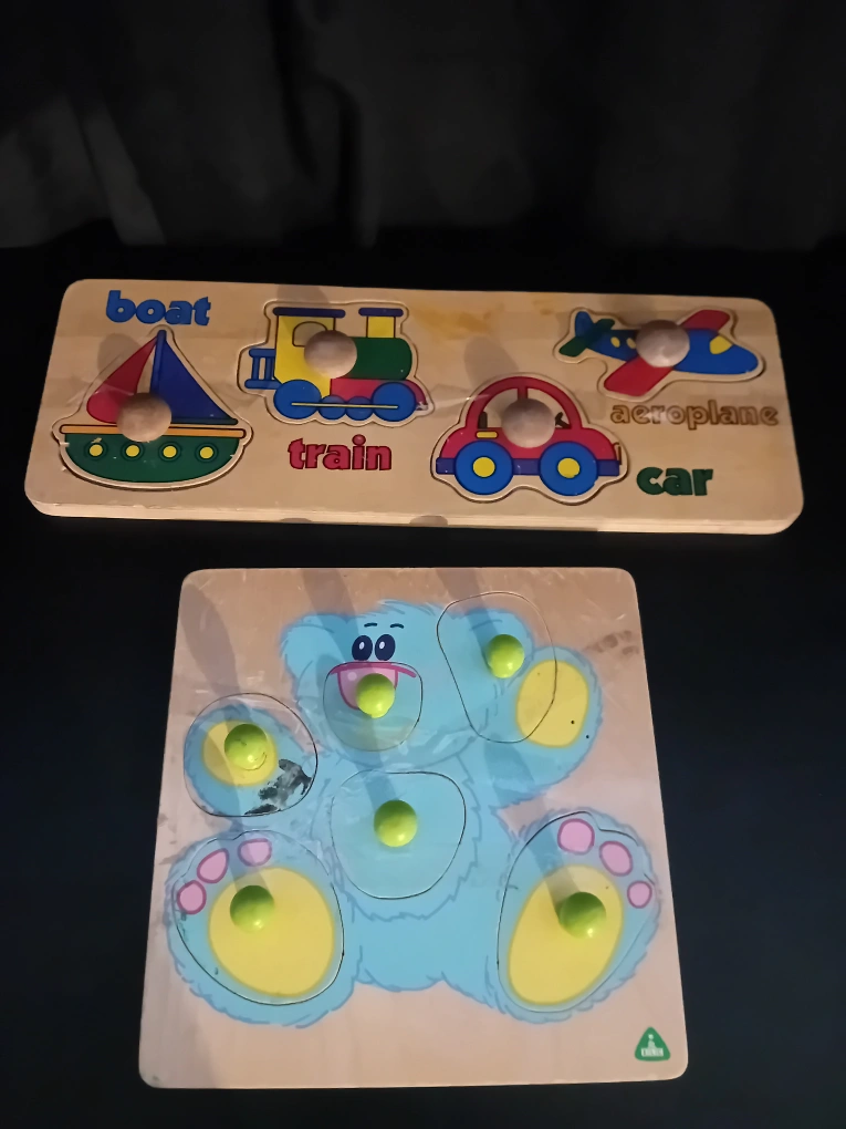 0 reviewsTwo wooden puzzles for little ones. One features a boat, train, car, and aeroplane. The other is a cute blue bear shape. Both are in good used condition and ready for a new home for some fun learning