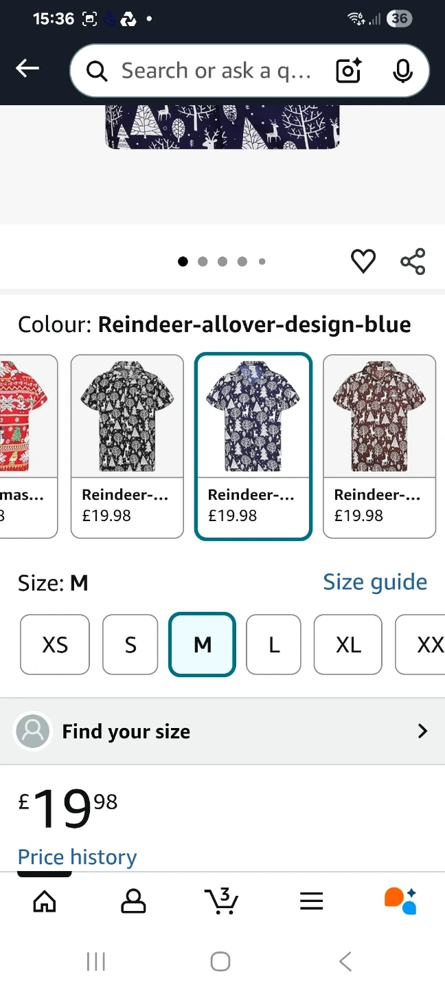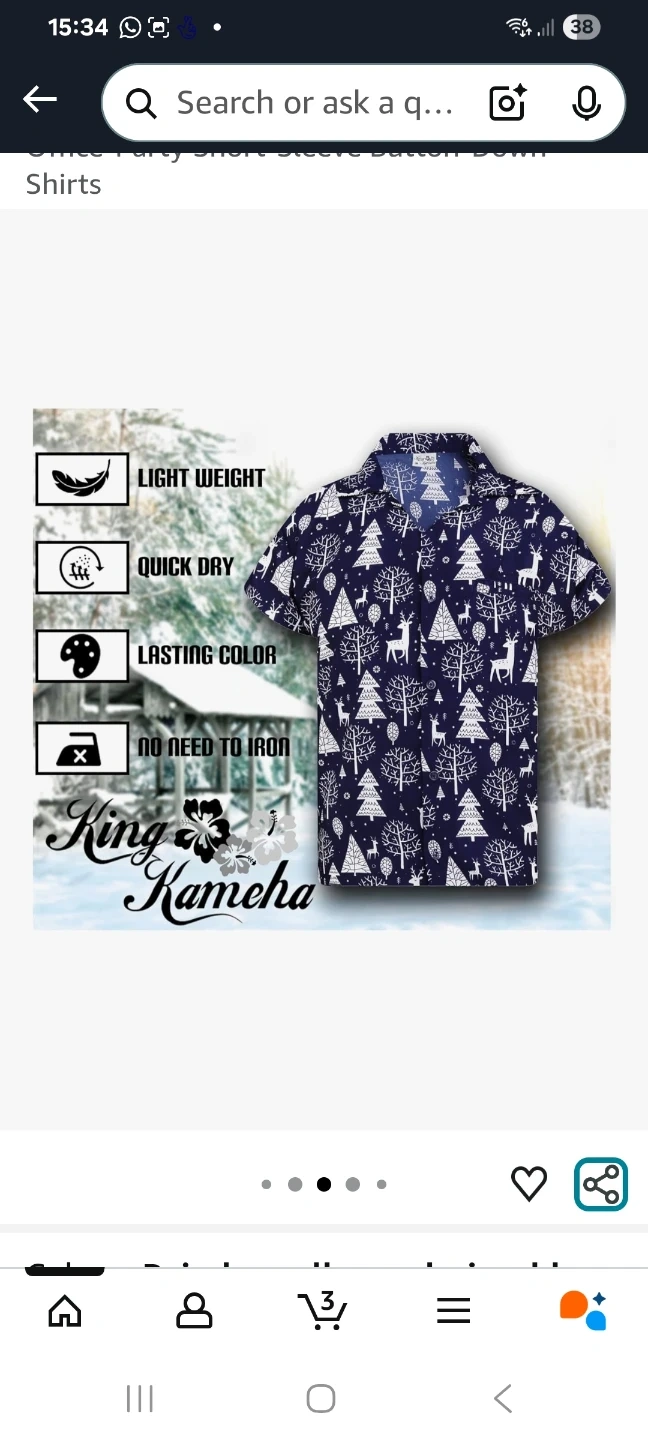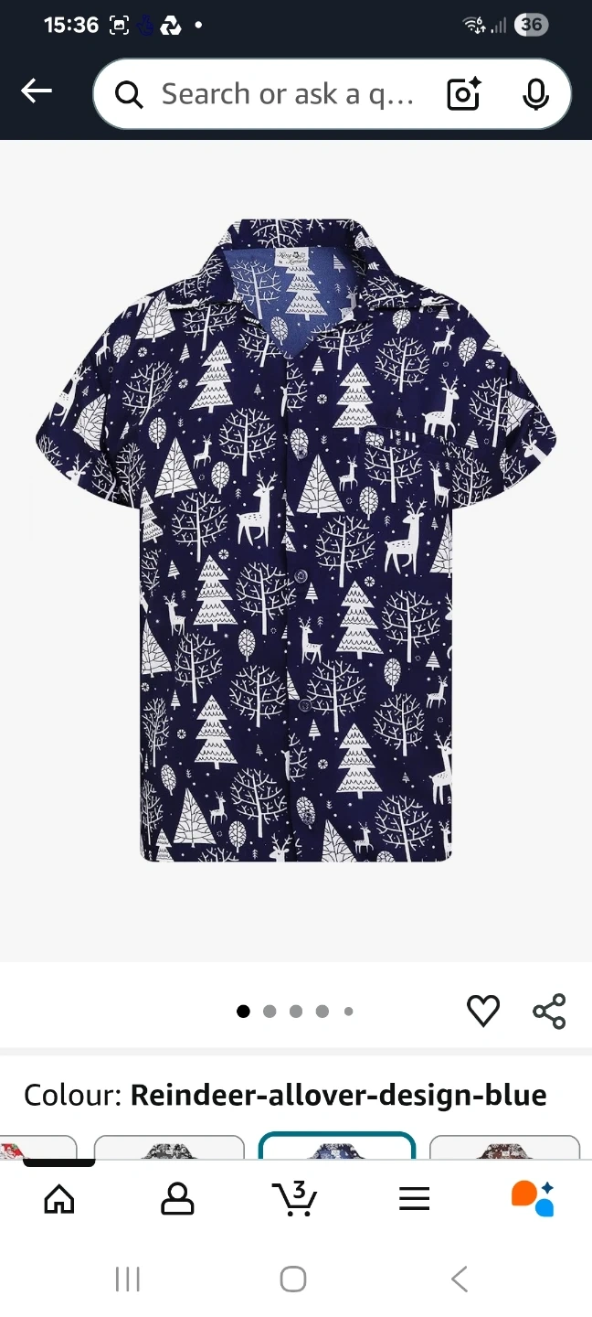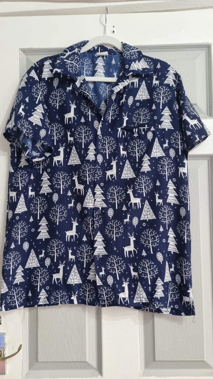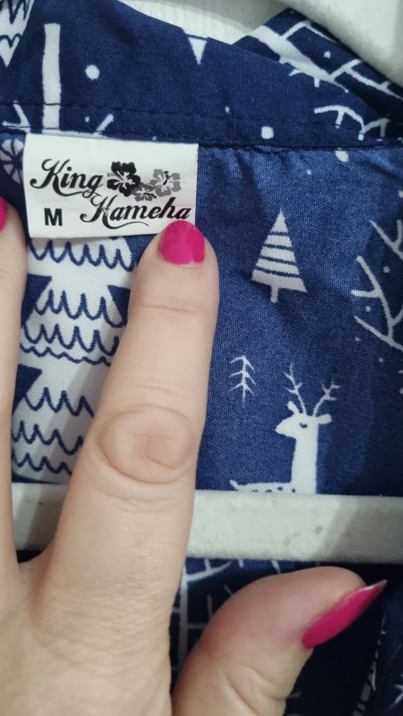 24 reviewsKing Kameha shirt in size medium, featuring a festive reindeer and Christmas tree print on a blue background. It's lightweight and quick-drying, and there's no need to iron it! Originally bought for £19.98