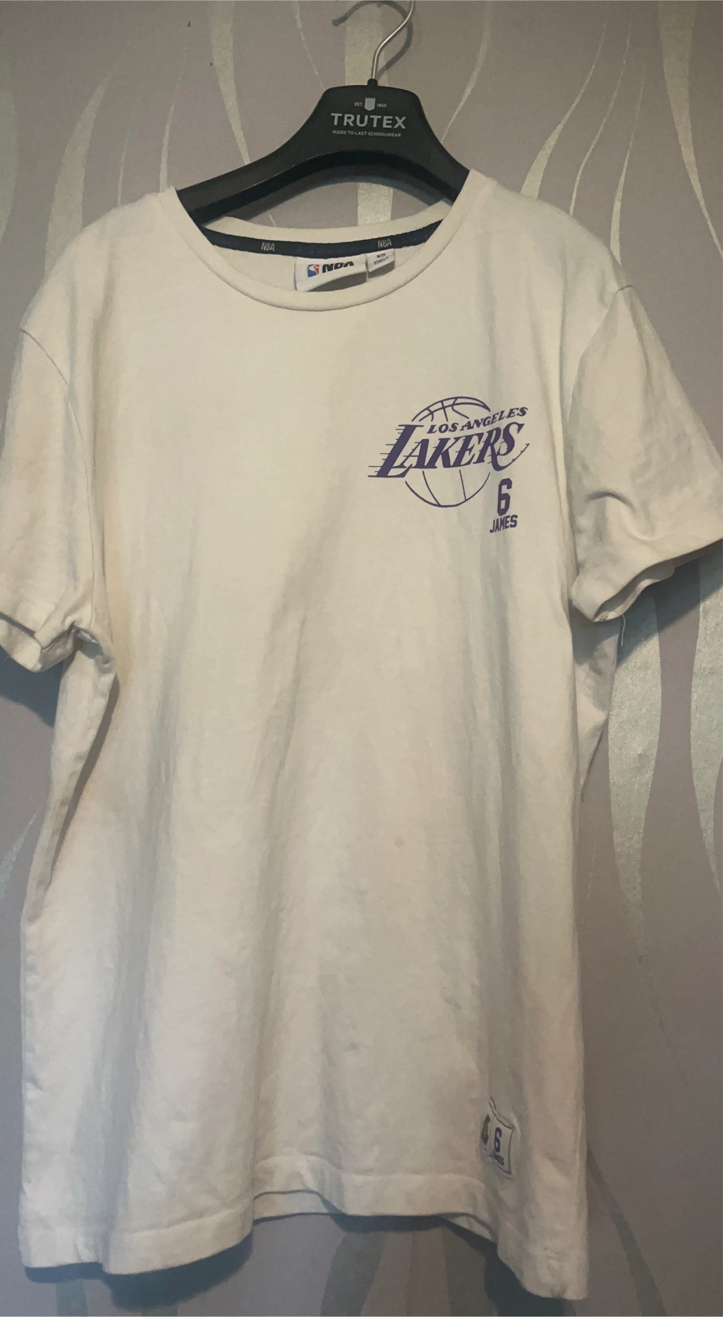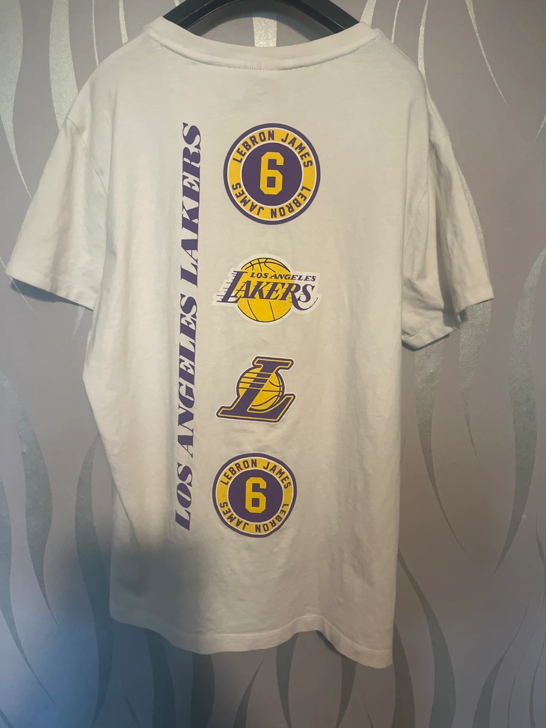 2 reviewsHere's a Los Angeles Lakers t-shirt featuring LeBron James. It's an official NBA item and is a size XS. The shirt is white with purple and gold accents, showcasing the Lakers logo and James' number 6 on the back