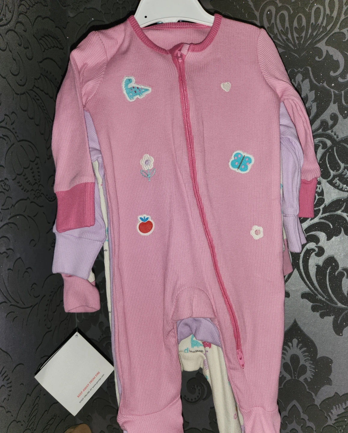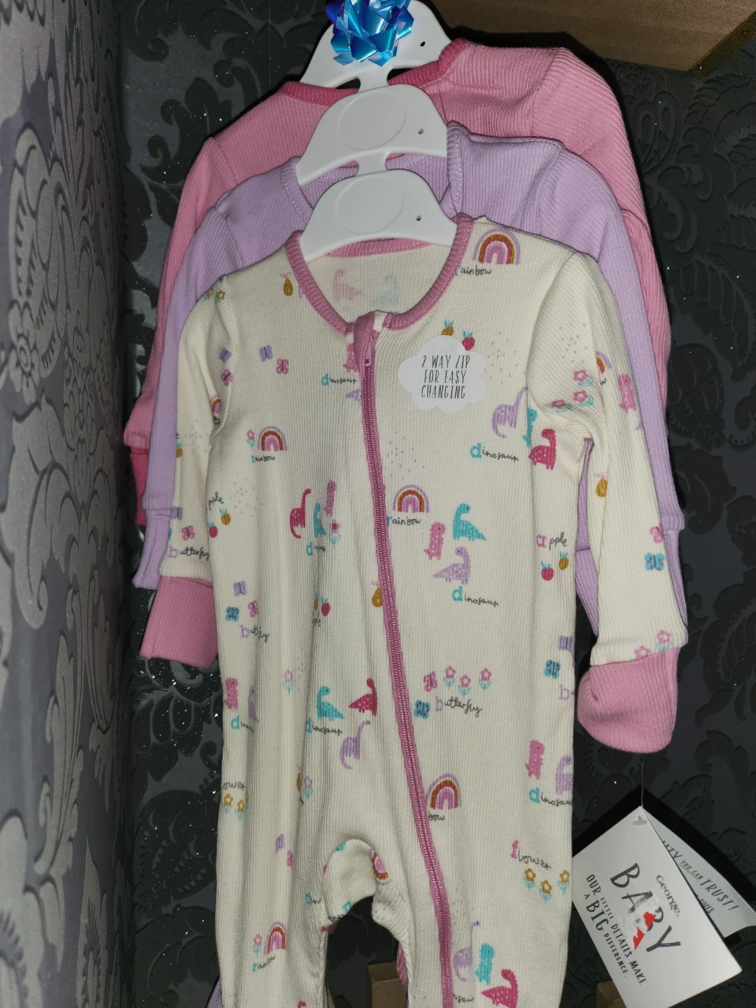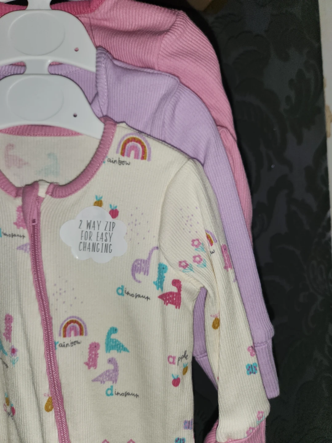 9 reviewsHere's a set of three baby sleepsuits from George. They feature a convenient 2-way zip for easy changing. The sleepsuits are adorned with cute dinosaur, rainbow, and apple designs. Perfect for keeping your little one snug and comfy!