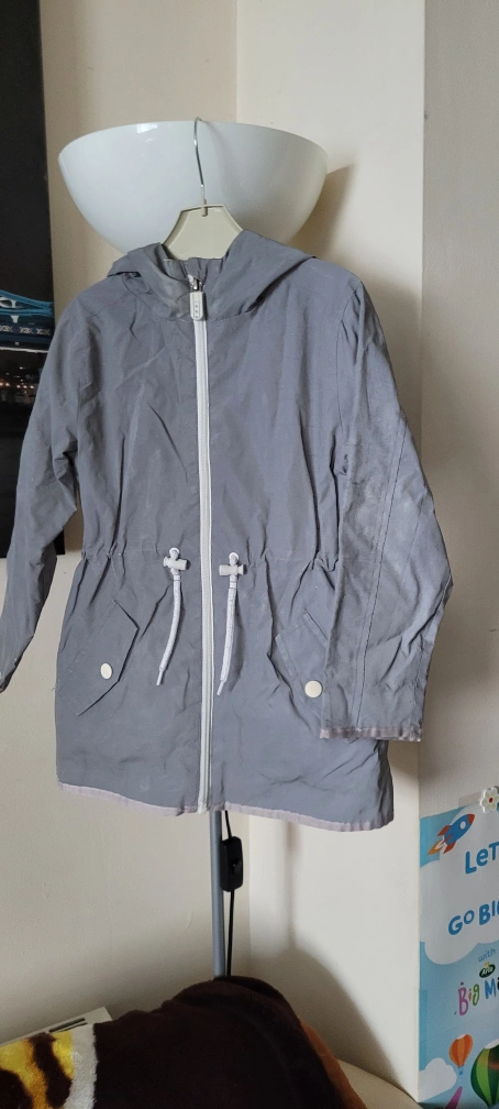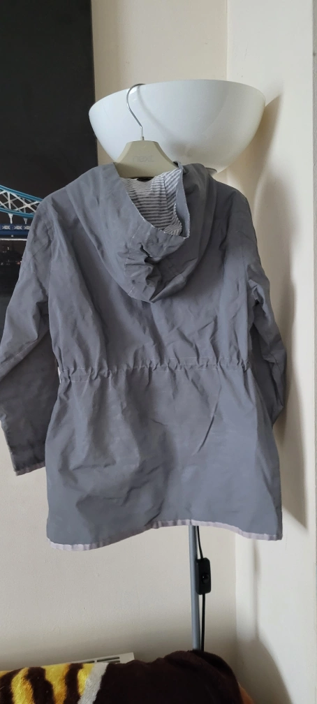 3 reviewsGrey lightweight waterproof, fully reflective in a dark jacket with hood and zip fastening. Drawstring waist and pockets. Cotton lined. In very good condition. Collection or local delivery.