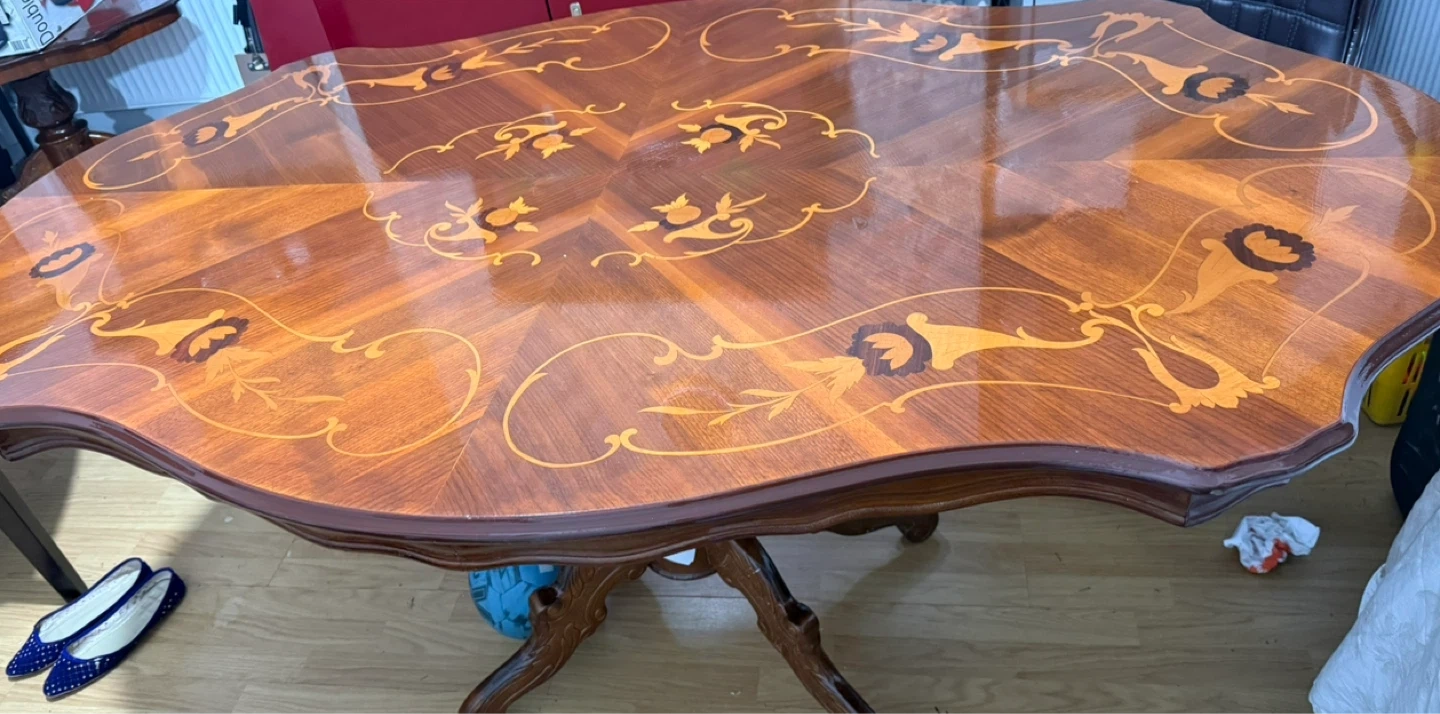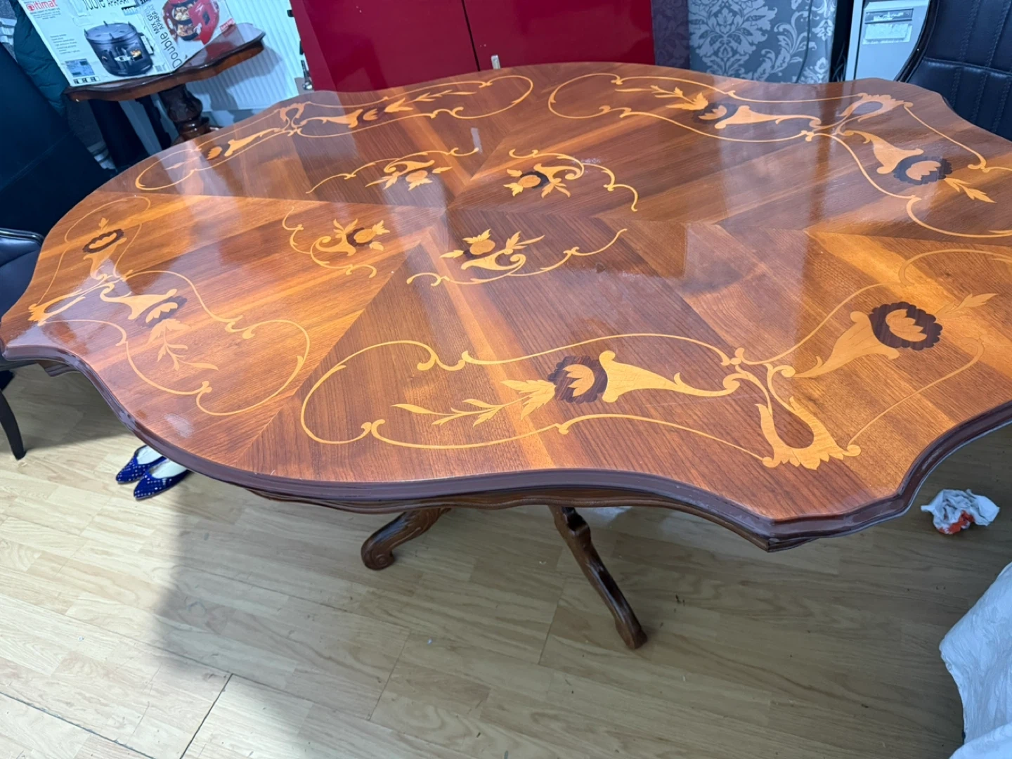 17 reviewsA lovely ornate wooden dining table, perfect for adding a touch of elegance to your dining room. The table features a beautiful floral design inlaid into the wood. It's in good condition and ready for a new home