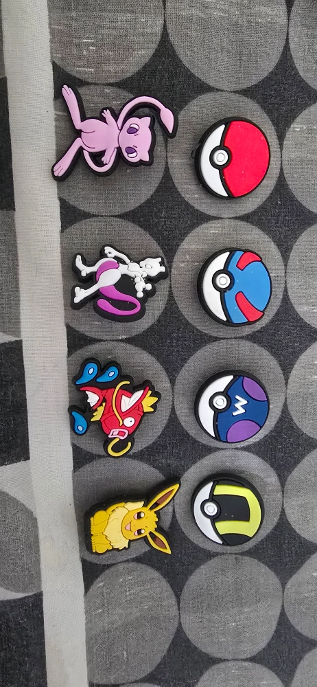 The Pokémon Croc Charms Assorted Designs Bundle Set features 8 shoe charms, including popular characters like Mewtu, GreatBall, and Magikarp. Made from water-resistant rubber, these multicoloured charms are perfect for Pokémon fans of all ages. The set includes various iconic Pokémon characters and designs, adding a fun and stylish touch to any pair of Crocs. Easy to attach and detach, these charming accessories are a must-have for any Pokémon enthusiast looking to personalise their footwear. Or if you really felt like it you could just wear them as a coat/t.shirt Pin each one was brought individually from Crocs rrp as follows; Mewtu £7.99 Eevee £3.99 Mew £6.99 Magikarp £5.99 PikaMaster Ball £5.99 Pokéball (Red) £4.99 Master Ball (Blue & Red) £5.99 Master Ball (Purple & Blue) £5.99 Pricing will be based on a; recommendation, b; item price when brought, c; previously sold bundles via CrocsXJibbitz