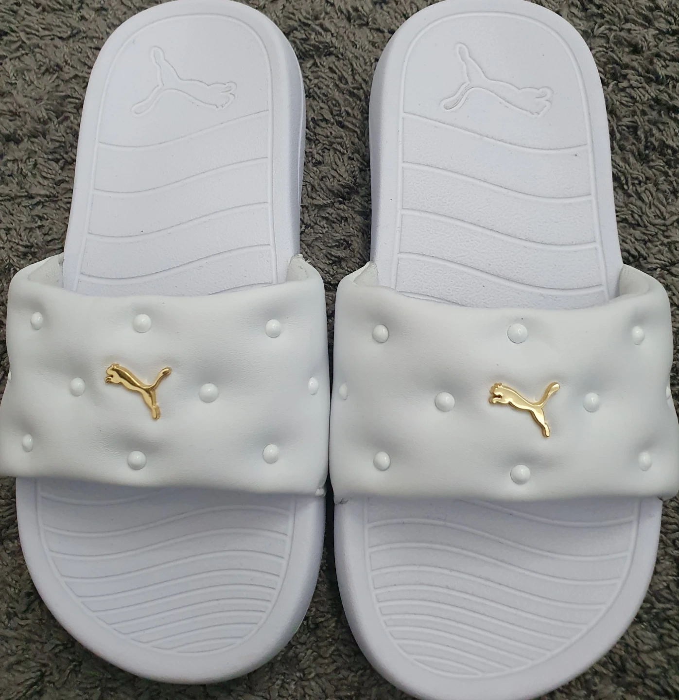 13 reviewsSelling a pair of Puma slides in white. They feature the Puma logo in gold. Perfect for summer! In excellent condition worn only twice Size 3 Rrp £26 Collection or can post for the cost of p&p
