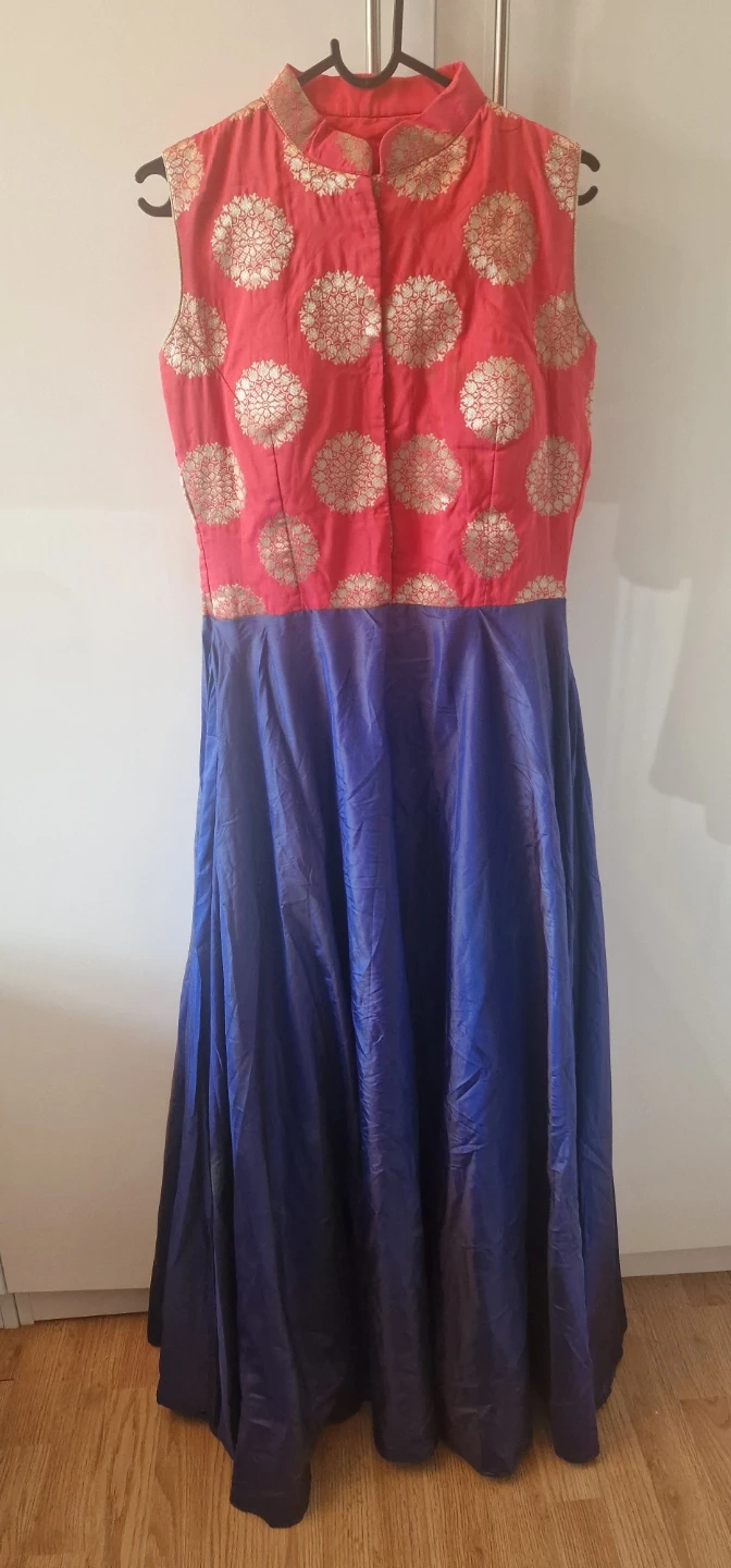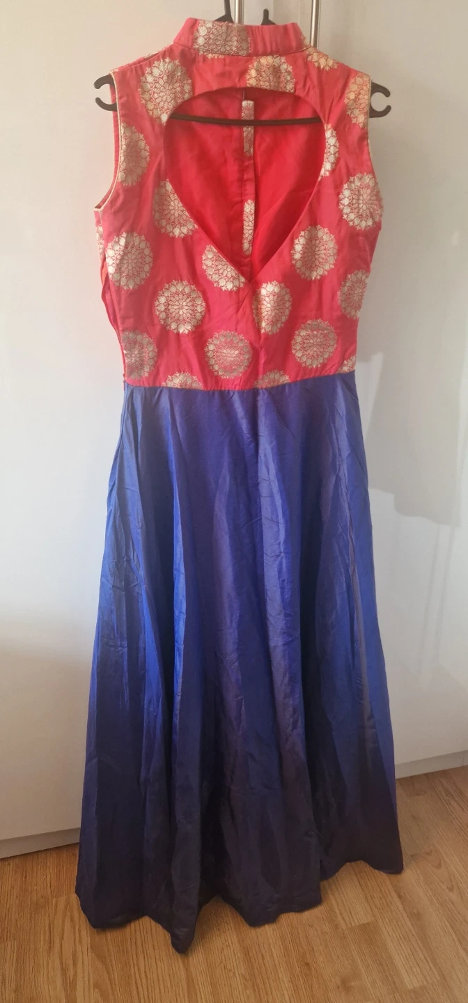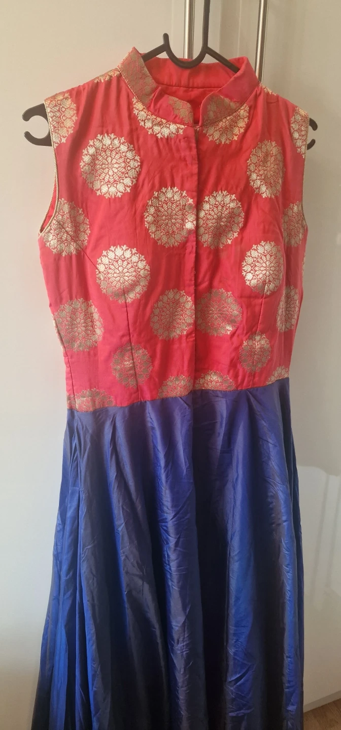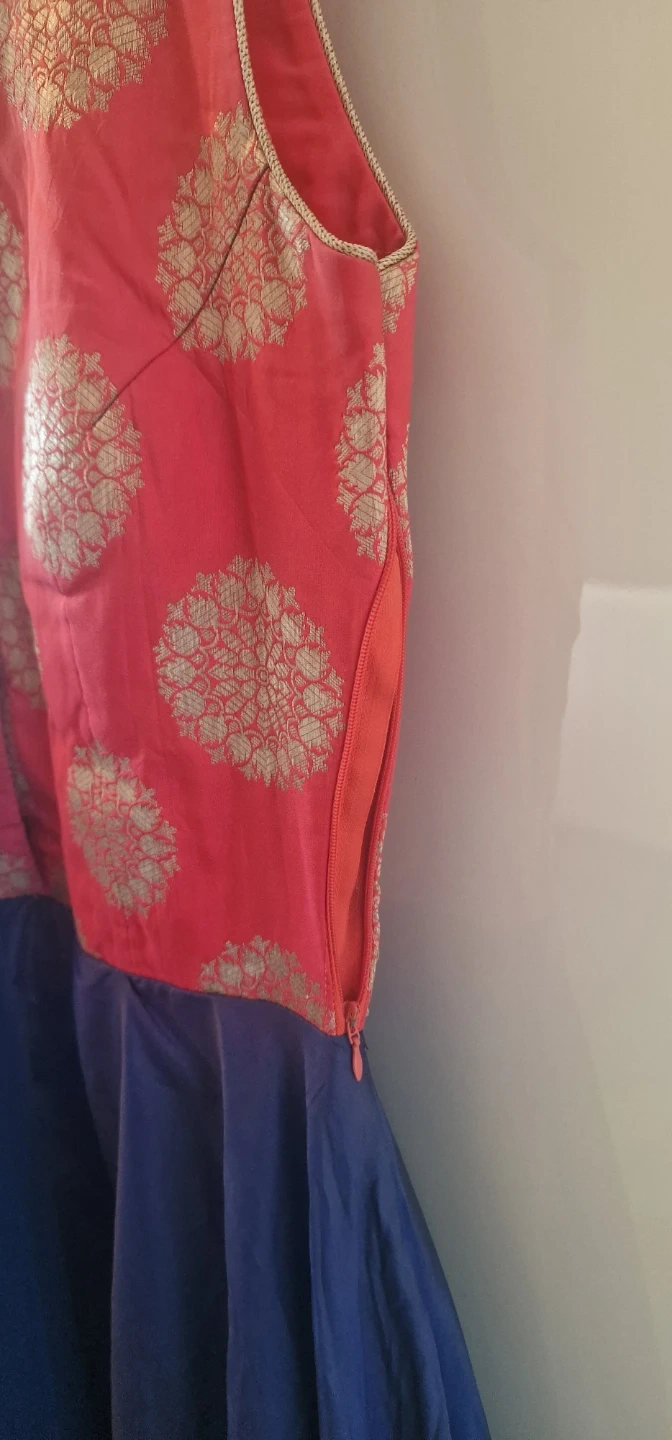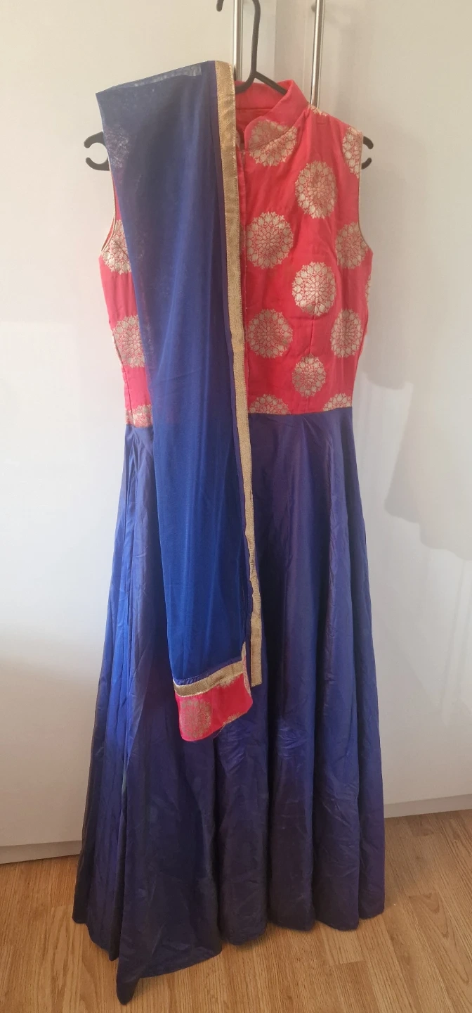7 reviewsA lovely Indian dress. Size 8-10. With side zip. Featuring a red and gold patterned top and a blue skirt. It comes with a matching blue scarf with red and gold trim. Perfect for a special occasion! Only £25.00 Collection B37