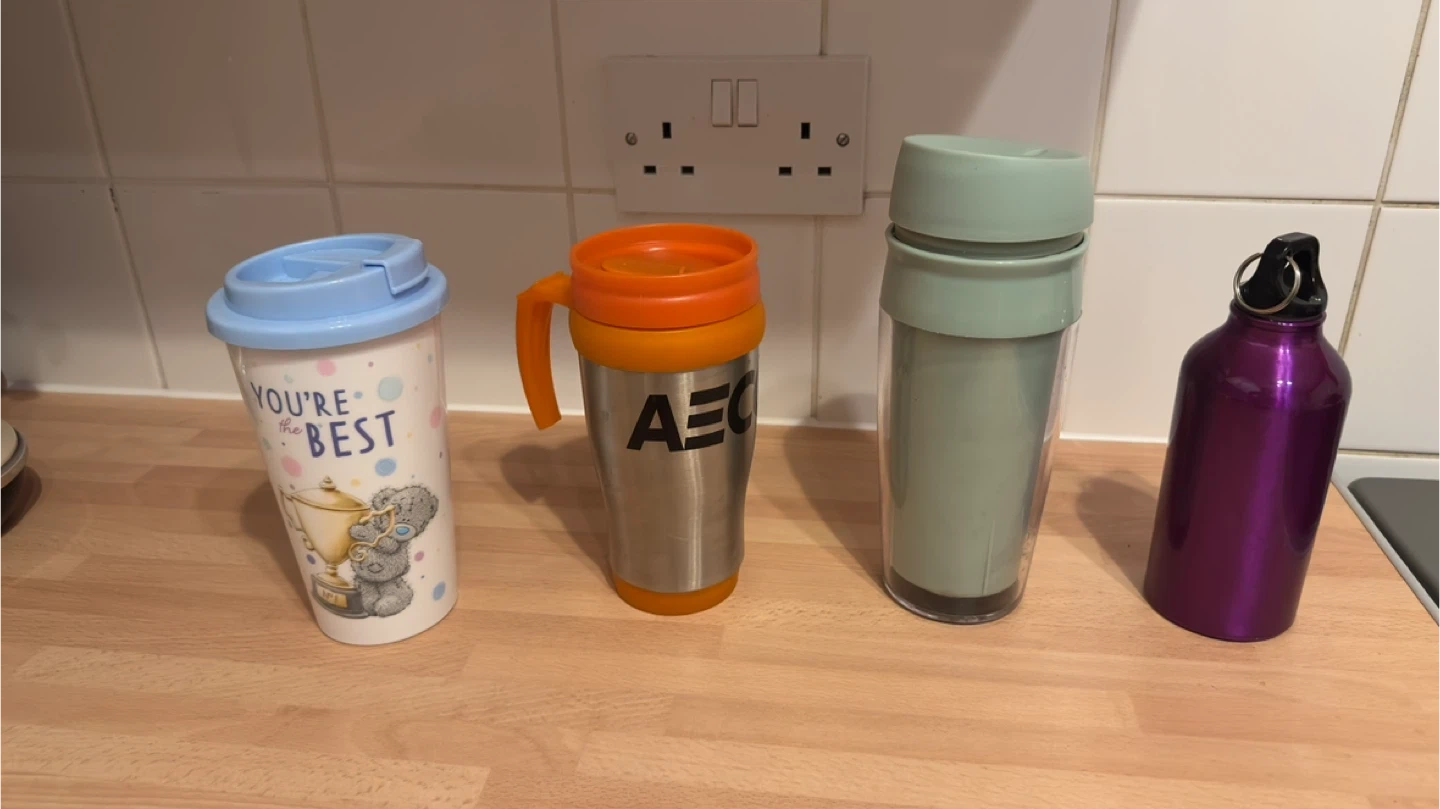2 reviewsReusable travel mugs and a water bottle. £1.5 each