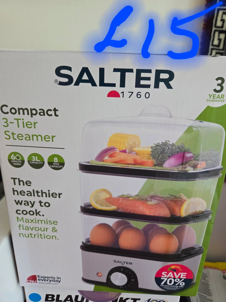 30 reviewsbrand new I'm selling a Salter 1760 compact 3-tier steamer. It's a healthier way to cook and maximises flavour and nutrition. It has a 60-minute timer, 3L capacity, and 8 egg capacity. Experts in everyday!