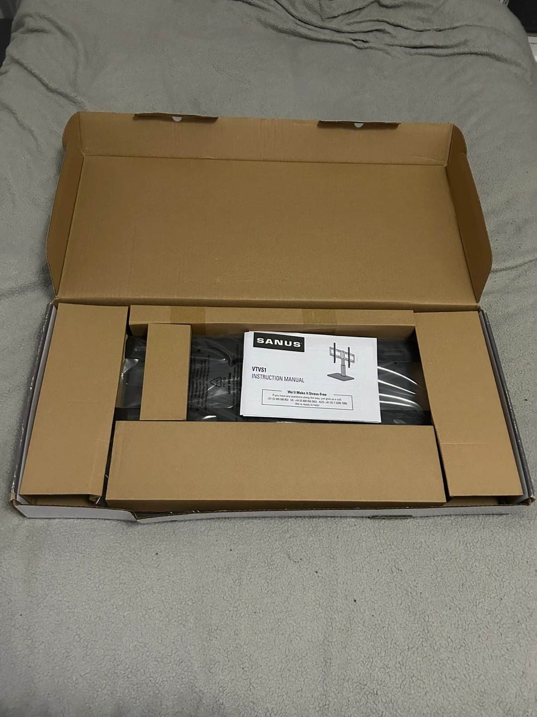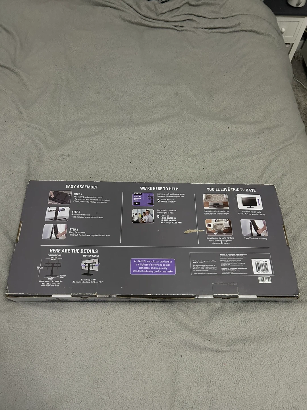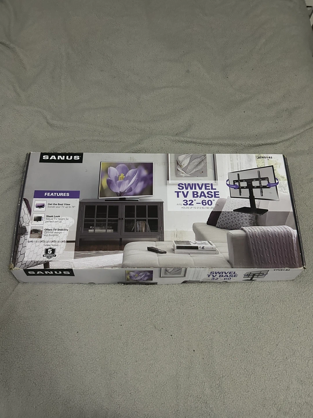 17 reviewsSelling a Sanus swivel TV base, suitable for TVs between 32 and 60 inches. It offers a sleek look and promises TV stability. The box includes an instruction manual to help with assembly