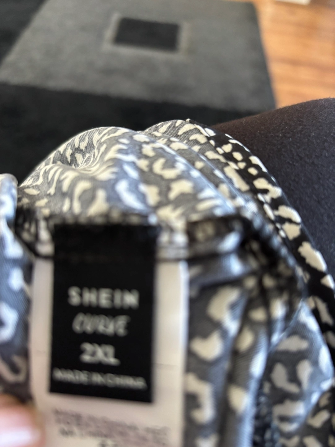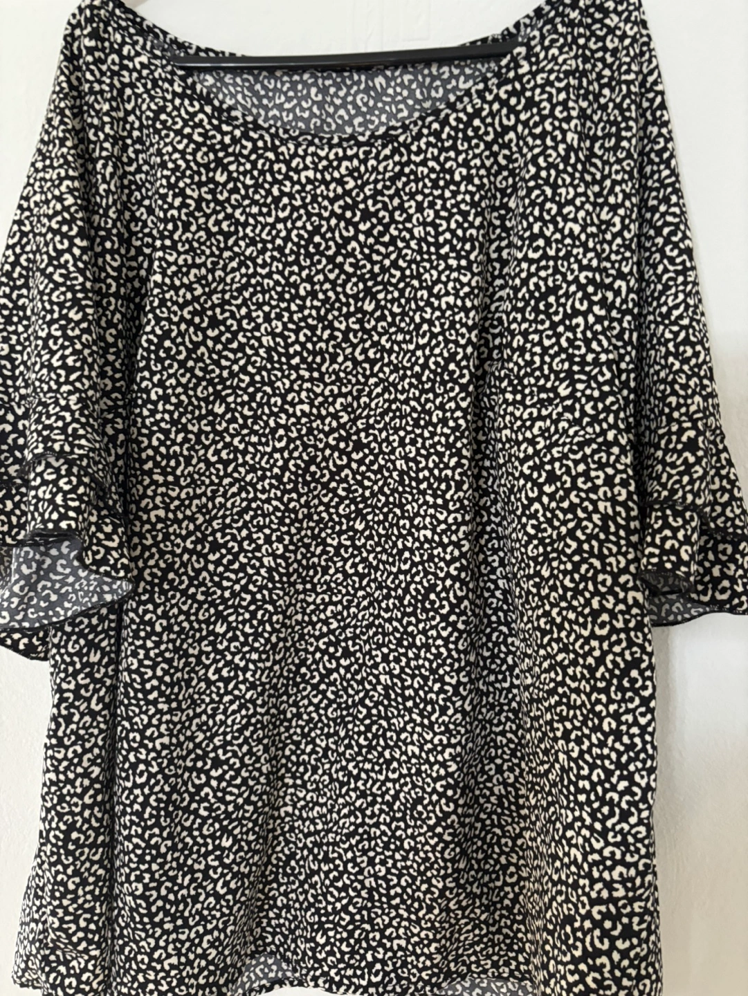 1 reviewBlack and white leopard print top. Size 2XL. Three-quarter sleeves with frilled edges. Round neck. Made in China.