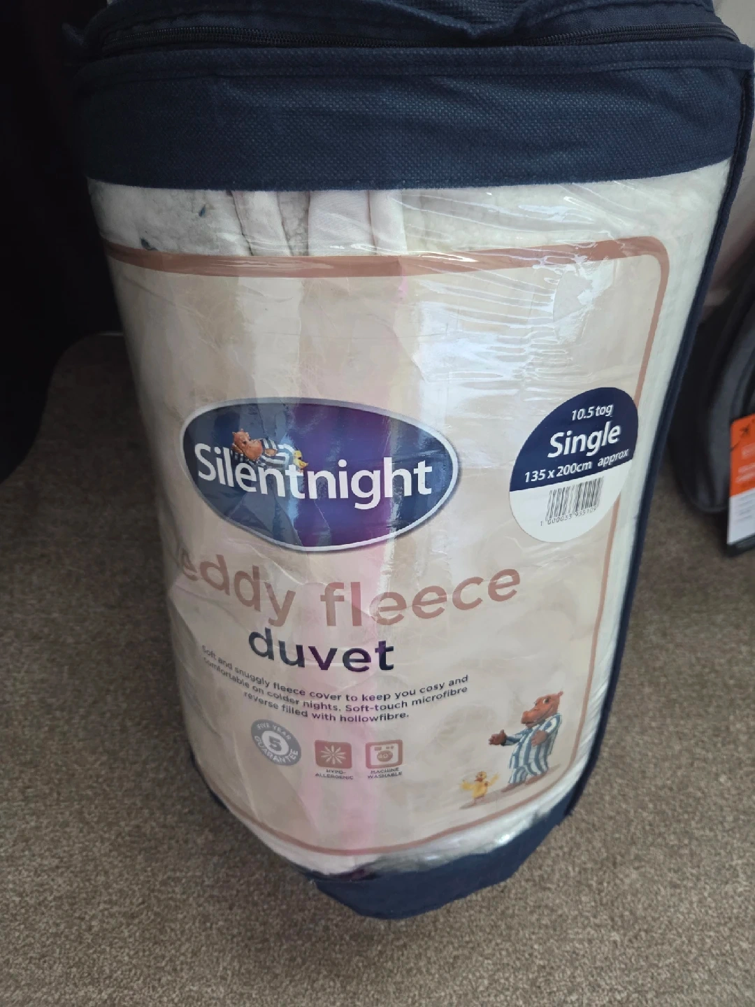 30 reviewsSnuggle up with this Silentnight Teddy Fleece duvet. It's a single size, approximately 135 x 200cm. The cover is a soft and snuggly fleece, perfect for keeping you cosy and comfortable on colder nights. It's also machine washable and hypoallergenic
