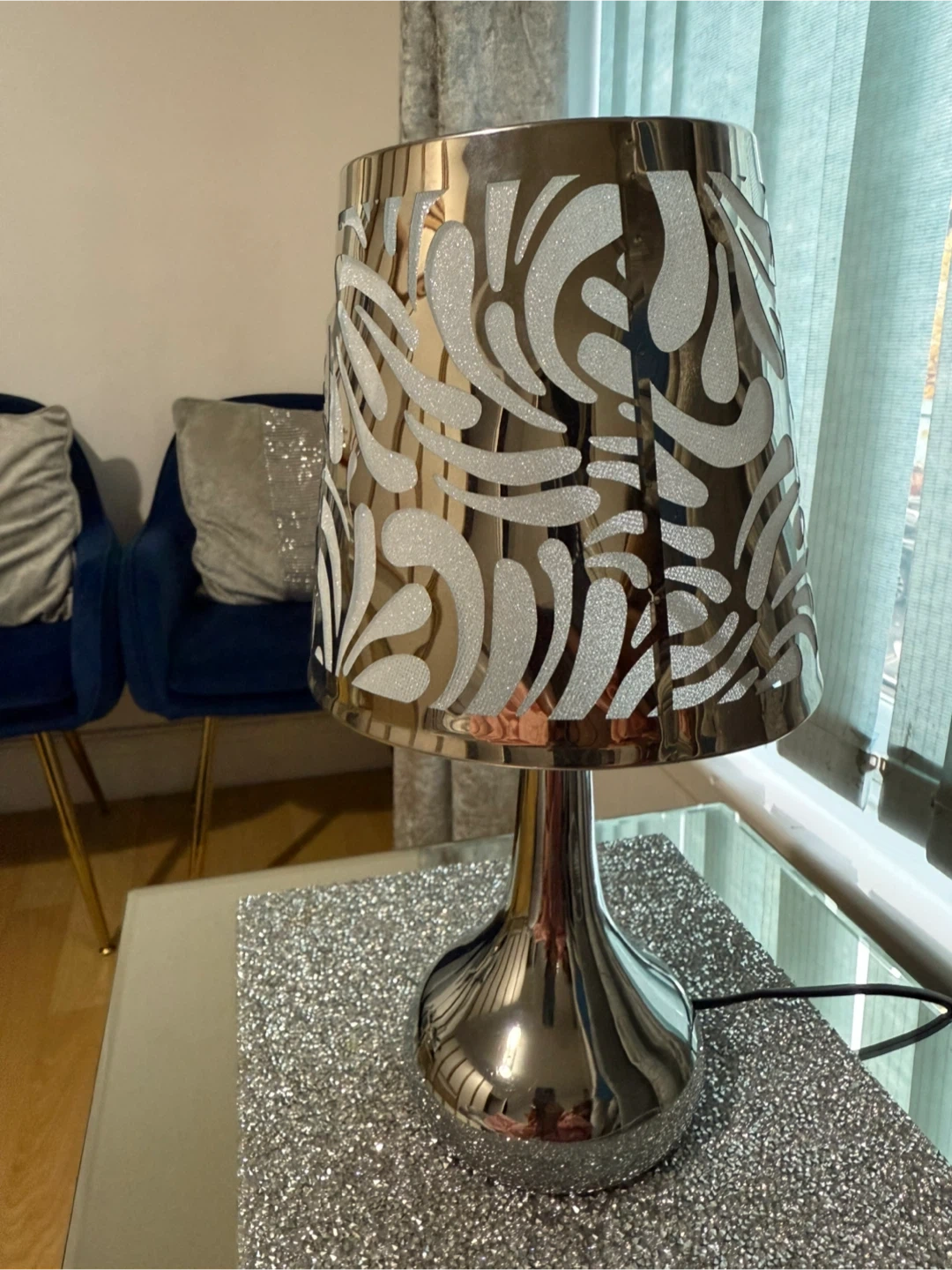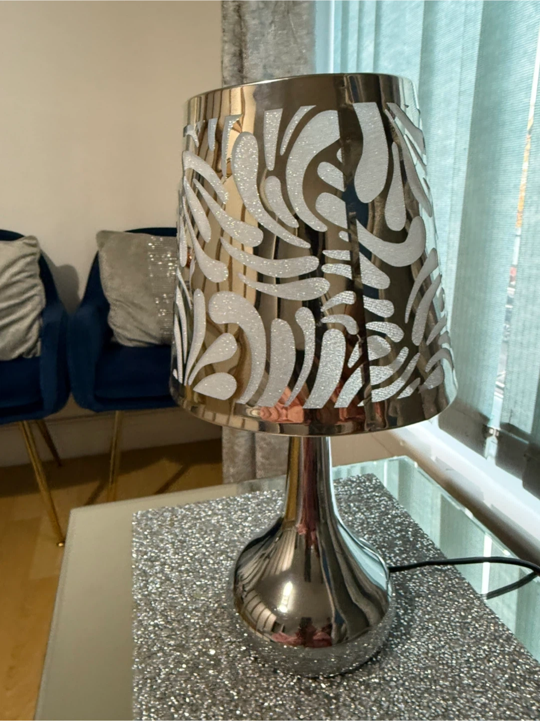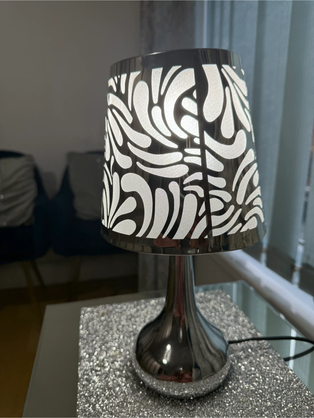 1 reviewHere's a lovely silver patterned table lamp, perfect for adding a touch of sparkle to any room. It's in great condition and would look fab on a bedside table or desk. The base and shade are both silver, with a stylish patterned design on the shade.