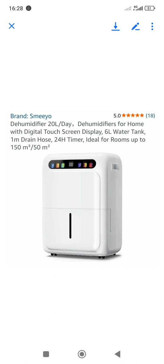 3 reviewsHere's a Smeeyo dehumidifier, perfect for keeping your home nice and dry. It can handle up to 20 litres a day and is ideal for rooms up to 150 m³/50 m². It has a digital touch screen display and a 6L water tank. Also comes with a 1m drain hose and a 24H timer