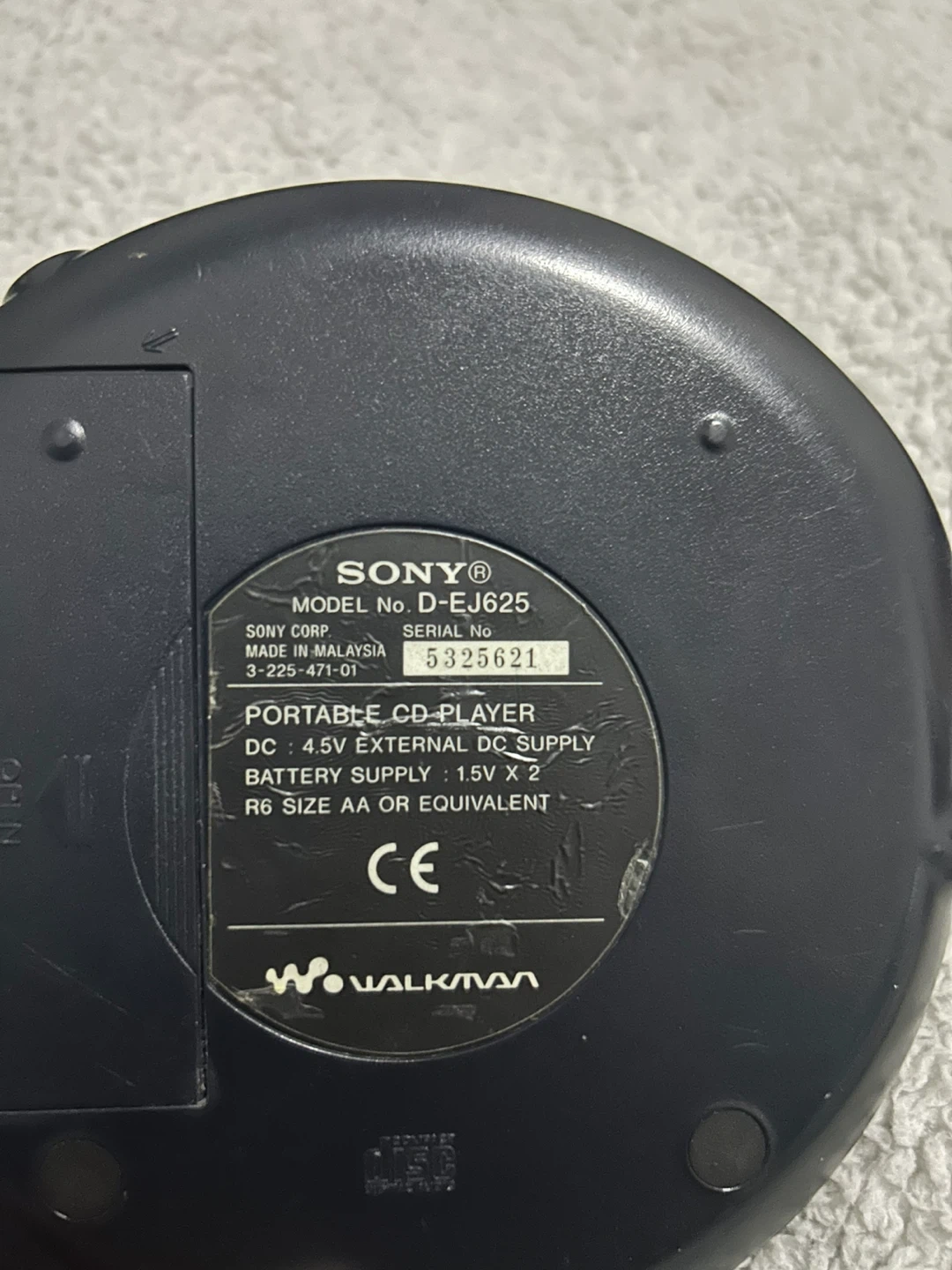 17 reviewsSelling a Sony Walkman D-EJ625 portable CD player. It's in good condition and ready to play your favourite CDs. It requires 1.5V x 2 AA size batteries or equivalent, and also has a DC 4.5V external DC supply.