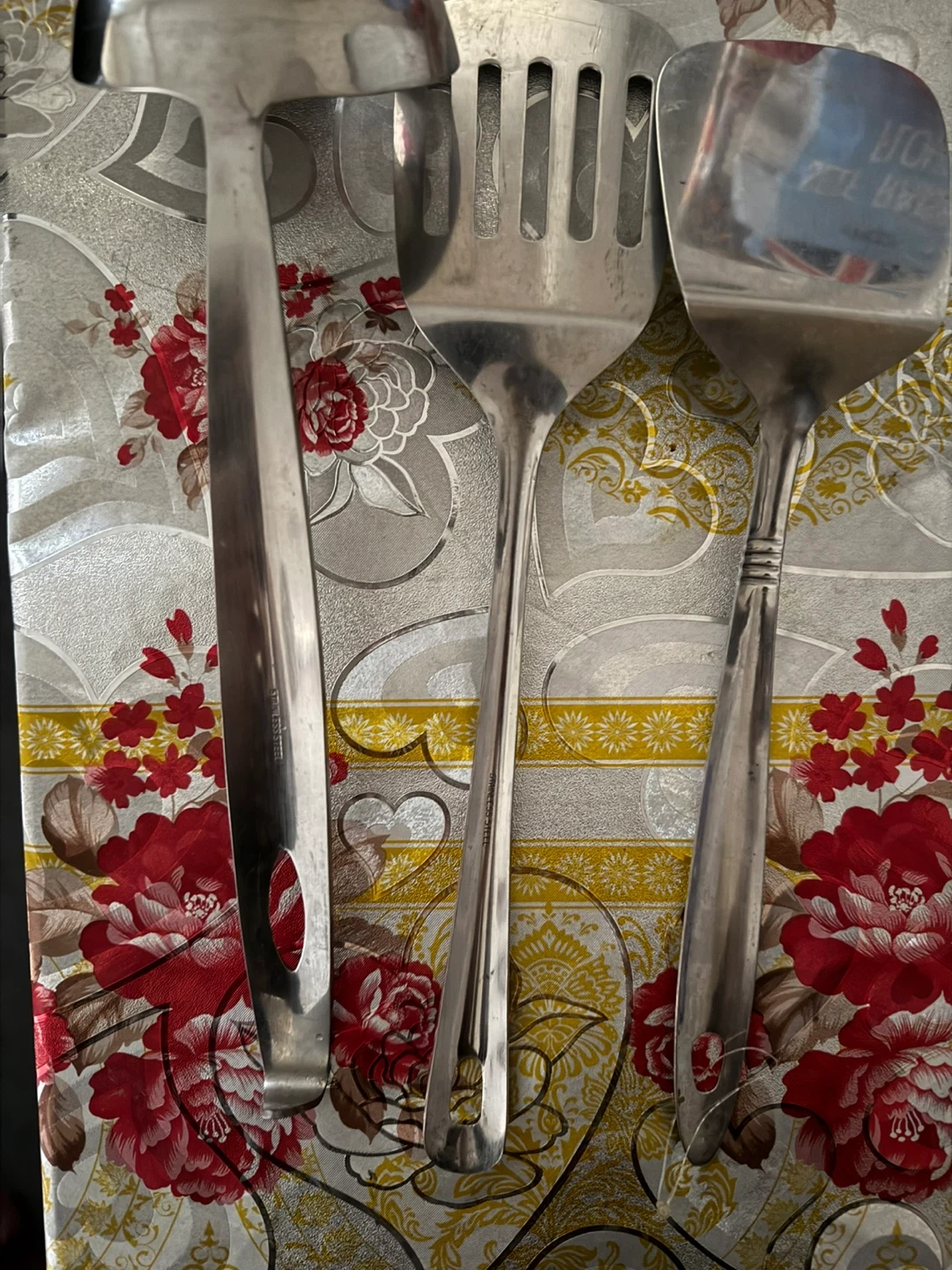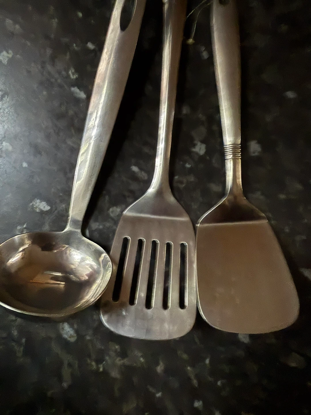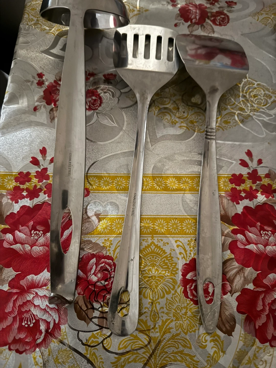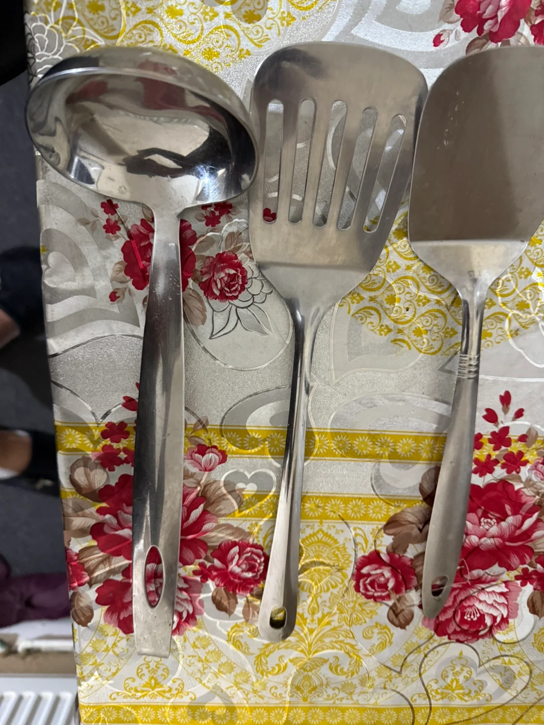 7 reviewsA set of three stainless steel kitchen utensils, including a ladle and two spatulas. Perfect for cooking up a storm in the kitchen! No use , just in my drawer Selling because moving next month In good condition
