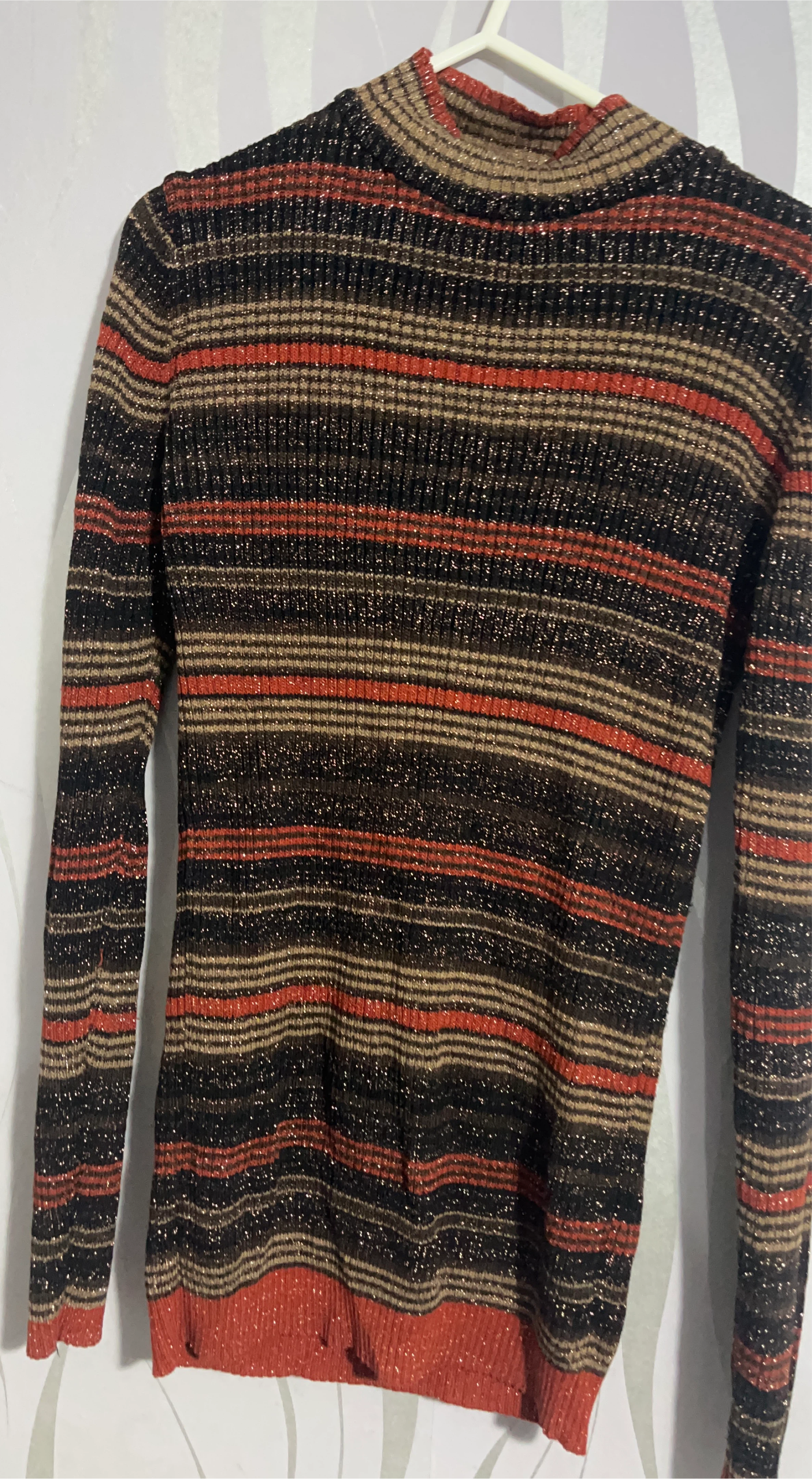 2 reviewsHere's a lovely striped jumper with a bit of sparkle! It's got a high neck and long sleeves, perfect for keeping cosy. The stripes are in shades of brown, orange and black, with a subtle shimmer throughout.
