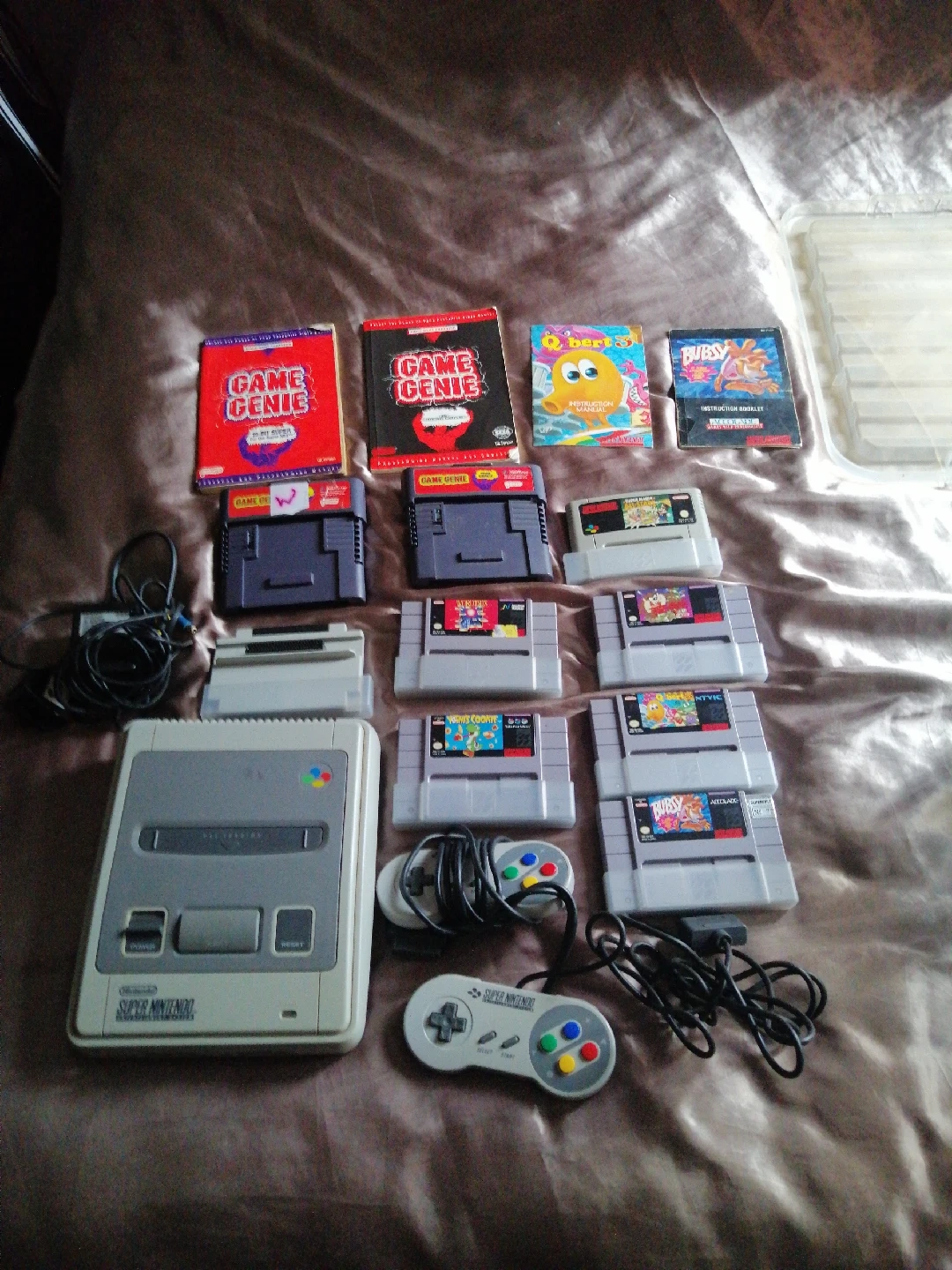 0 reviewsSelling a Super Nintendo console with a selection of games. Includes the console, controllers, and a few game cartridges like Bubsy and Q-bert. Also includes Game Genie.