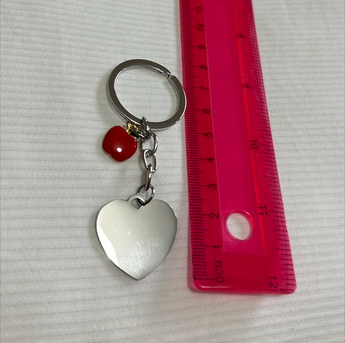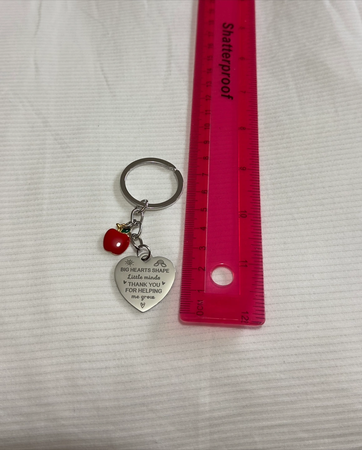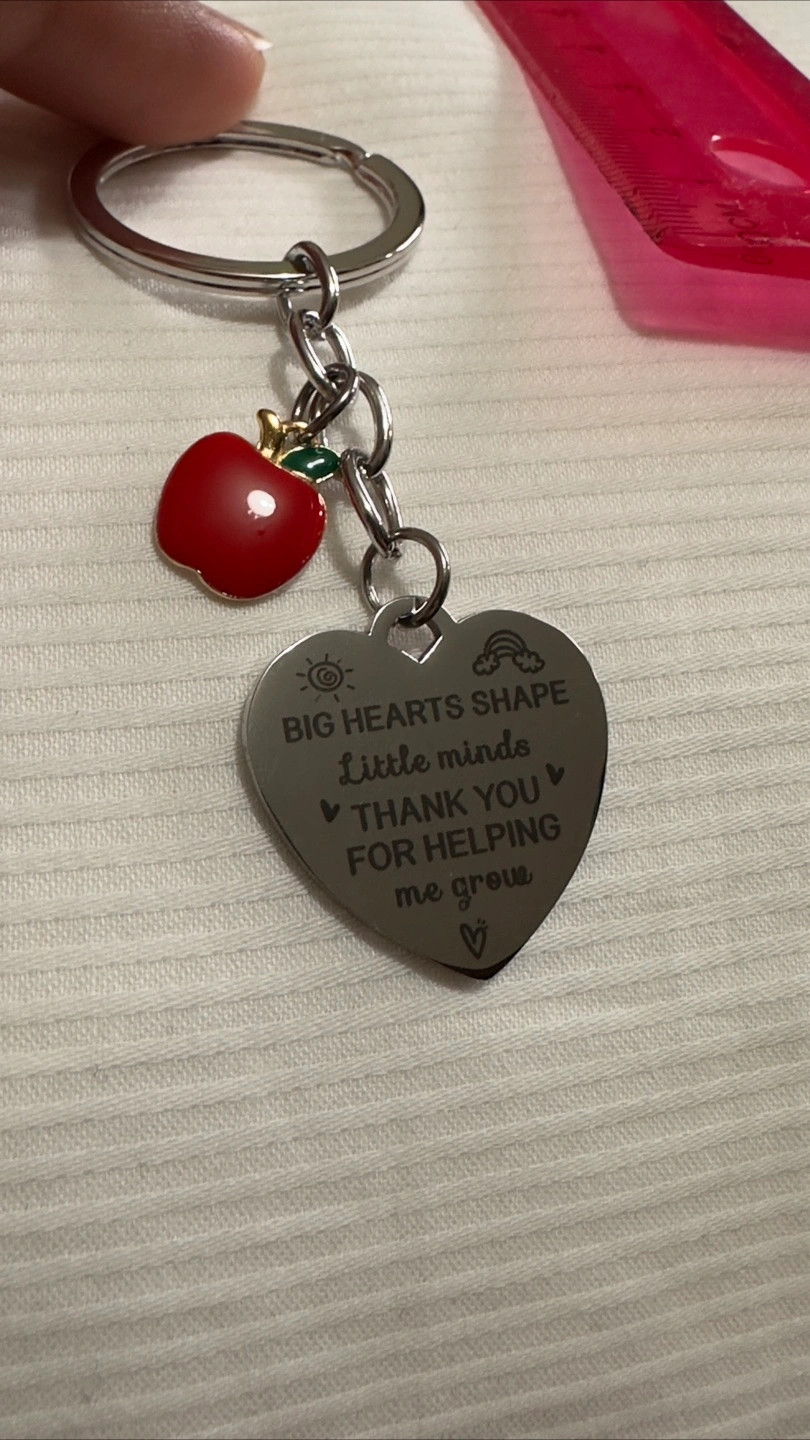 2 reviewsA lovely little keychain to show your appreciation for a teacher. It features a heart-shaped pendant with the inscription 'Big Hearts Shape Little Minds, Thank you for helping me grow' and a cute little red apple charm. Perfect as a small gift!