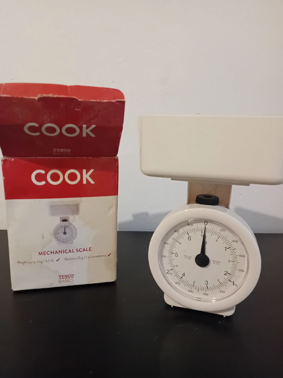 0 reviewsSelling a Tesco Cook mechanical scale, complete with its original box. It's in good working order and can weigh up to 3 kg / 6.5 lb. A handy addition to any kitchen!