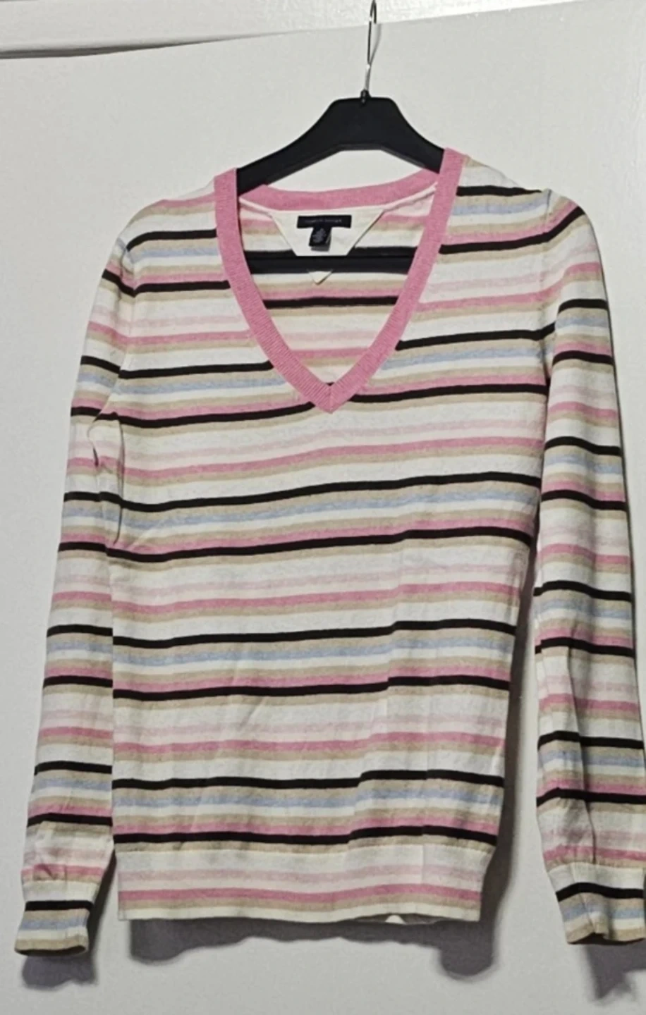18 reviewsTommy Hilfiger striped jumper in size M. It features a V-neck and long sleeves. The material feels soft and comfortable, perfect for layering or wearing on its own DM for Details