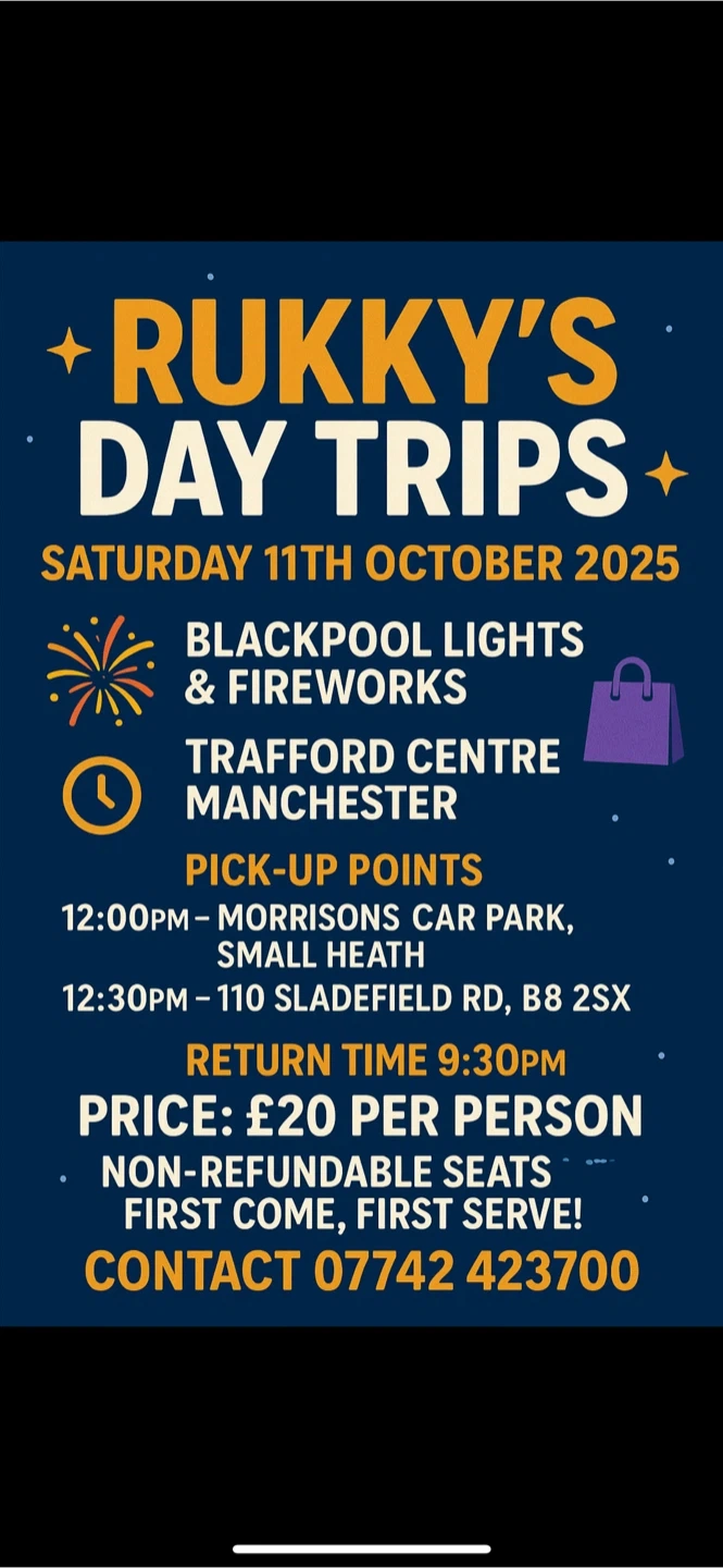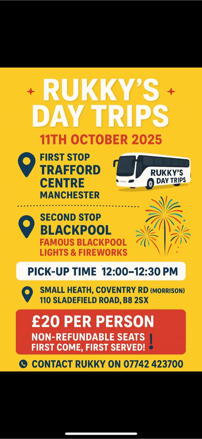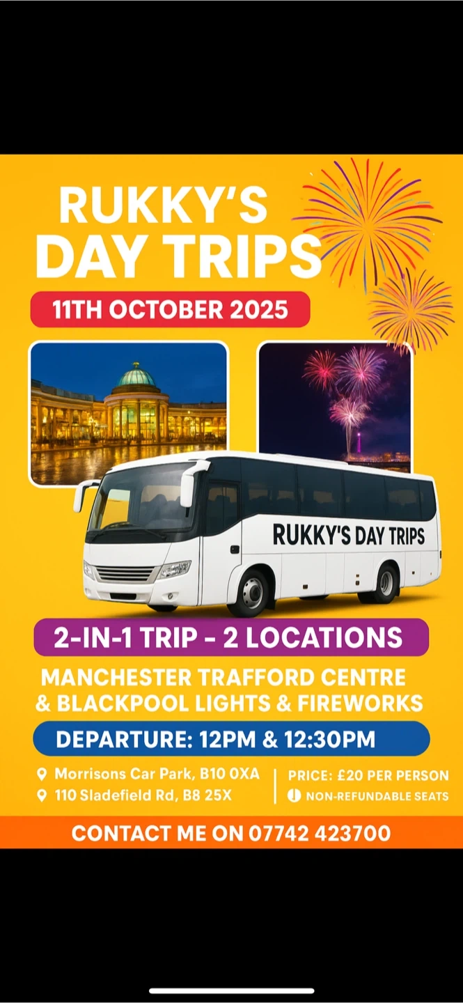 1 reviewI’m organising my final trip this summer to machester first Trafford centre then to Blackpool for the lights and fireworks last fireworks this year Canada will be doing 11th October £20 per person book now limited seats