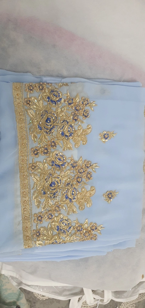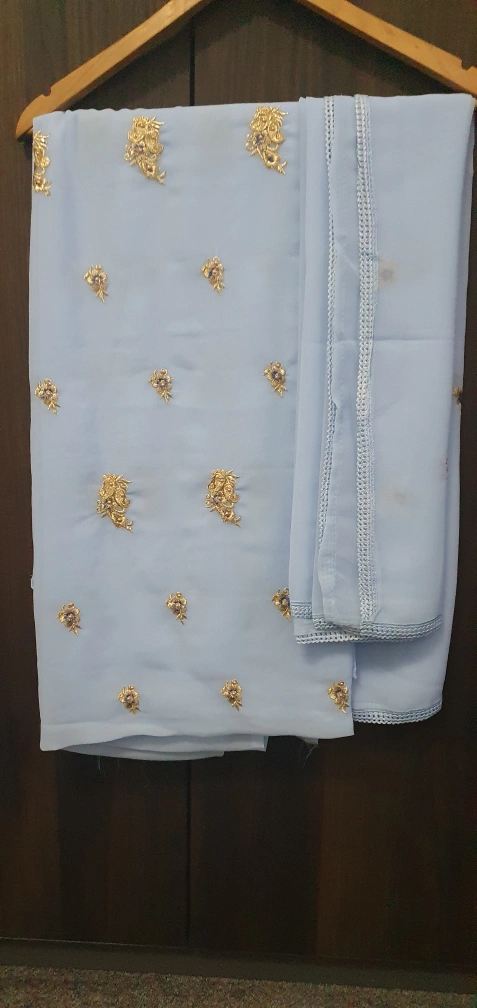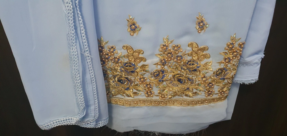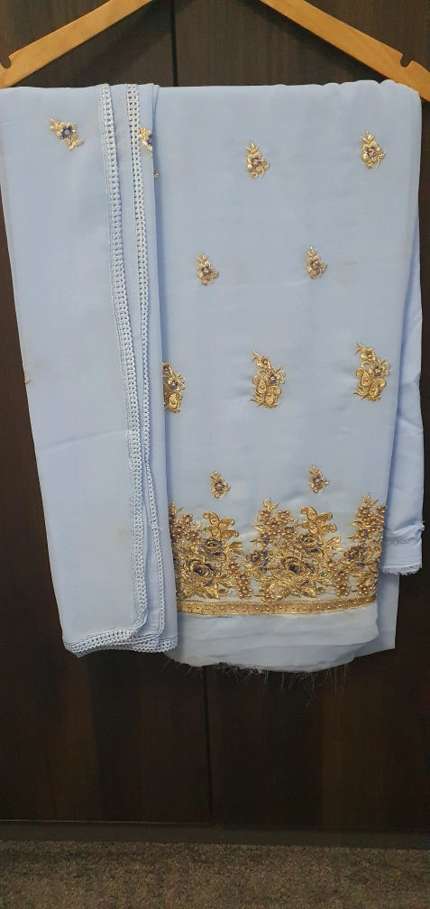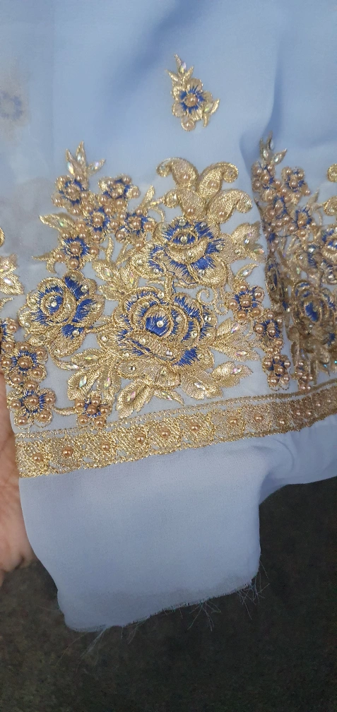 7 reviewsA beautiful light blue unstitched suite with intricate gold and blue embroidery. Perfect for a special occasion.