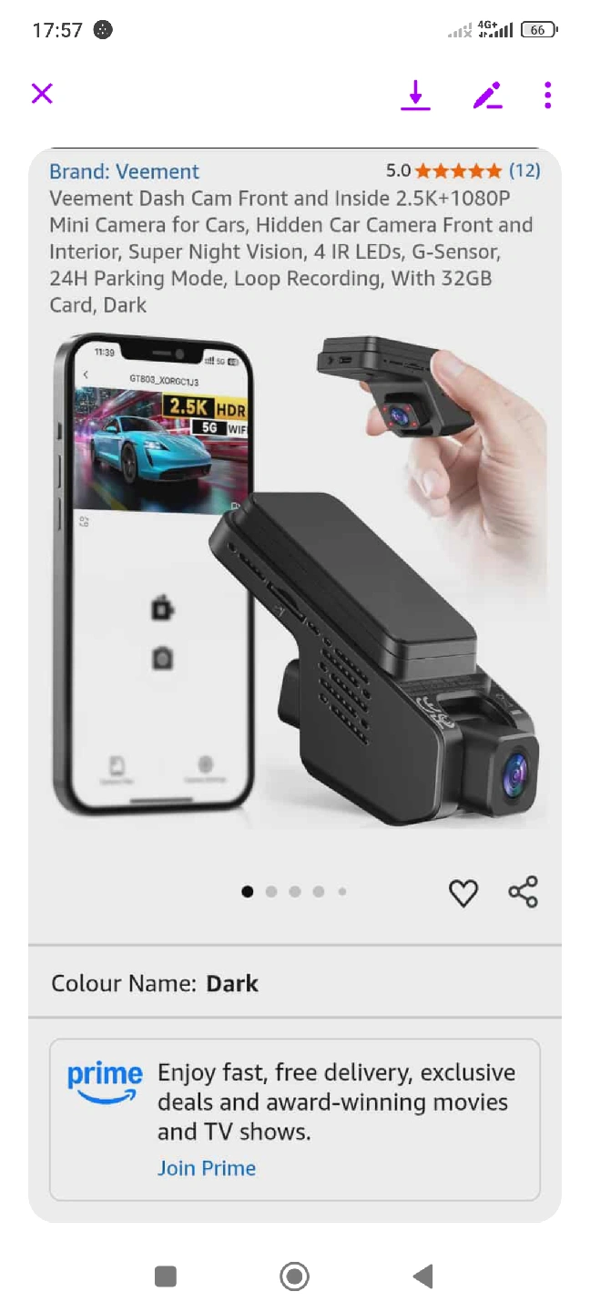 3 reviewsVeement Dash Cam for cars. It's a mini camera with front and interior views, recording in 2.5K+1080P. It has super night vision, 4 IR LEDs, G-Sensor, 24H parking mode, and loop recording. Comes with a 32GB card and is dark in colour