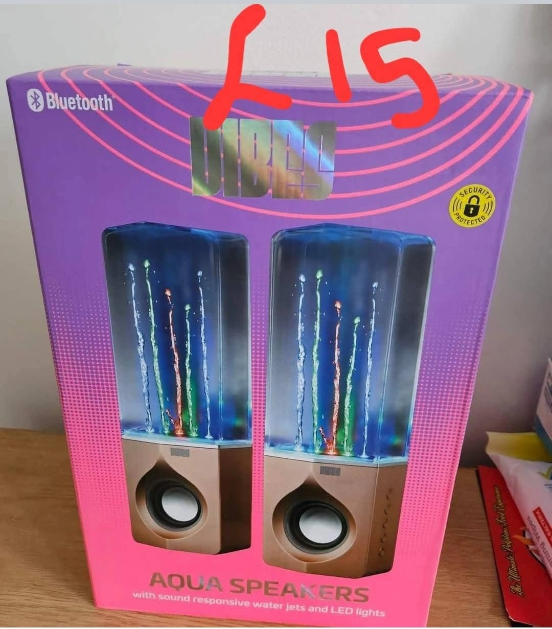 30 reviewsSelling a set of VIBRO! Aqua Speakers, brand new in box! These speakers feature sound-responsive water jets and LED lights for a cool visual effect. They also connect via Bluetooth. Box is included!