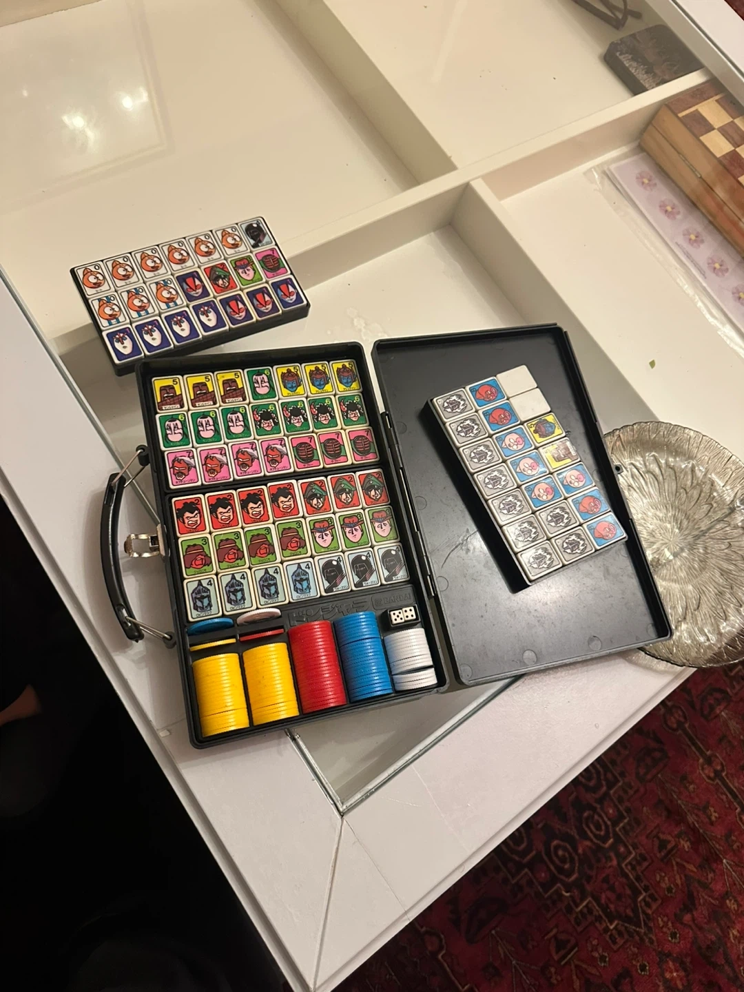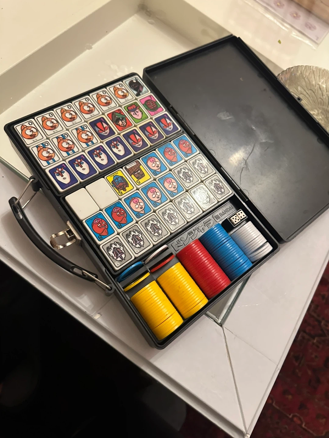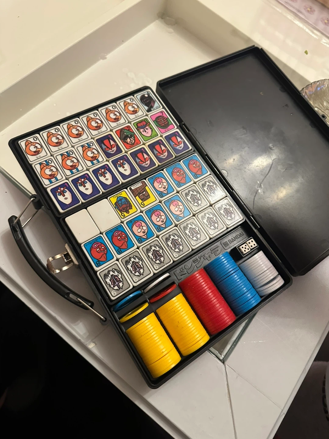 0 reviewsSelling a vintage Bandai Dokapon game set. It comes in a black carry case with a golden graphic on the front. The set includes the playing tiles, chips in various colours, and a dice. A fun retro game for collectors or anyone looking for a unique game night!