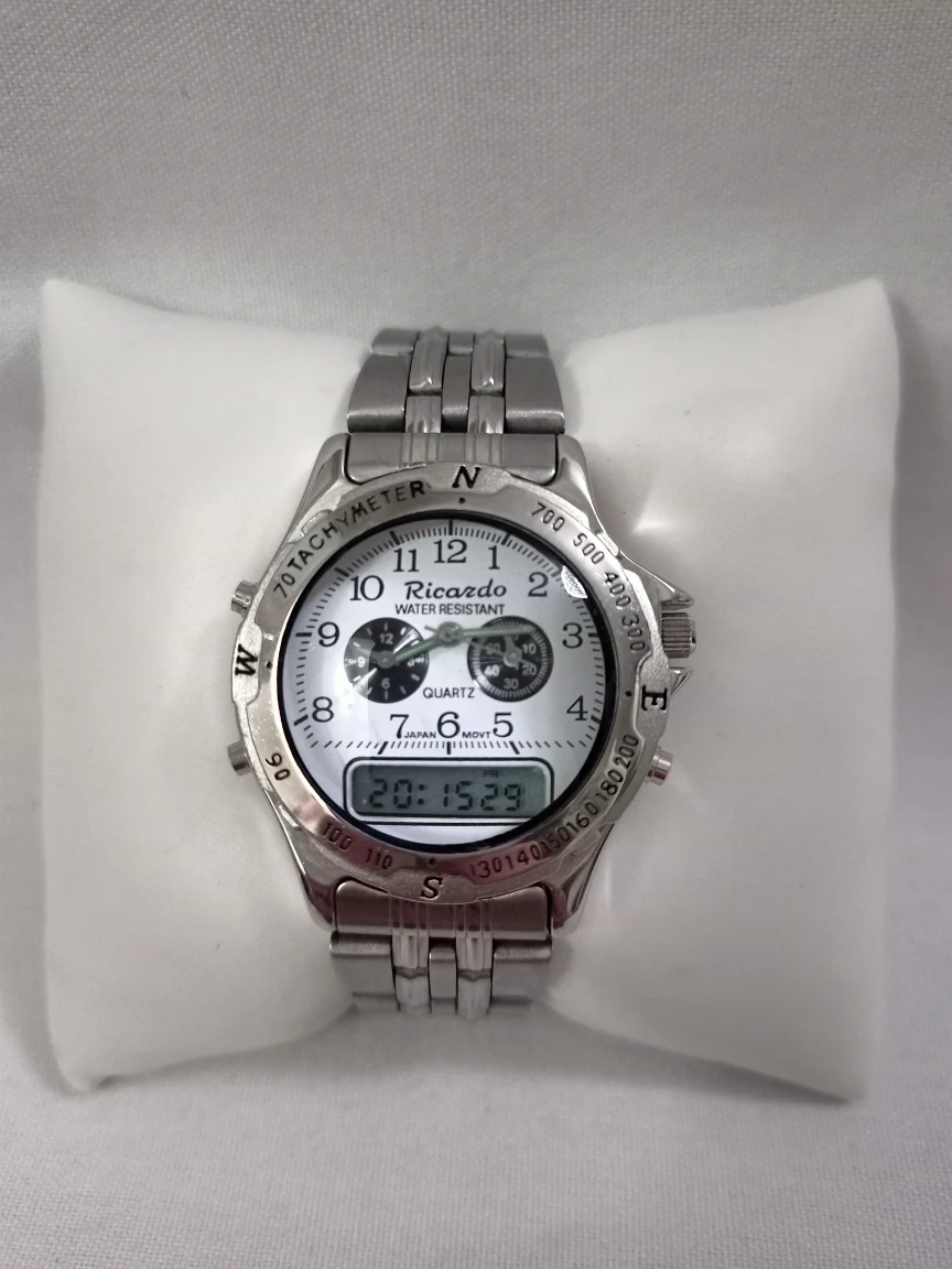 149 reviewsLOVELY VINTAGE RICARDO TACHYMETER QUARTZ ANALOGUE/DIGITAL WATCH STRAP SET AT APPROX 6.5" ONE SMALL SCRATCH ON FACE FROM USE VERY GOOD CONDITION OVERALL.