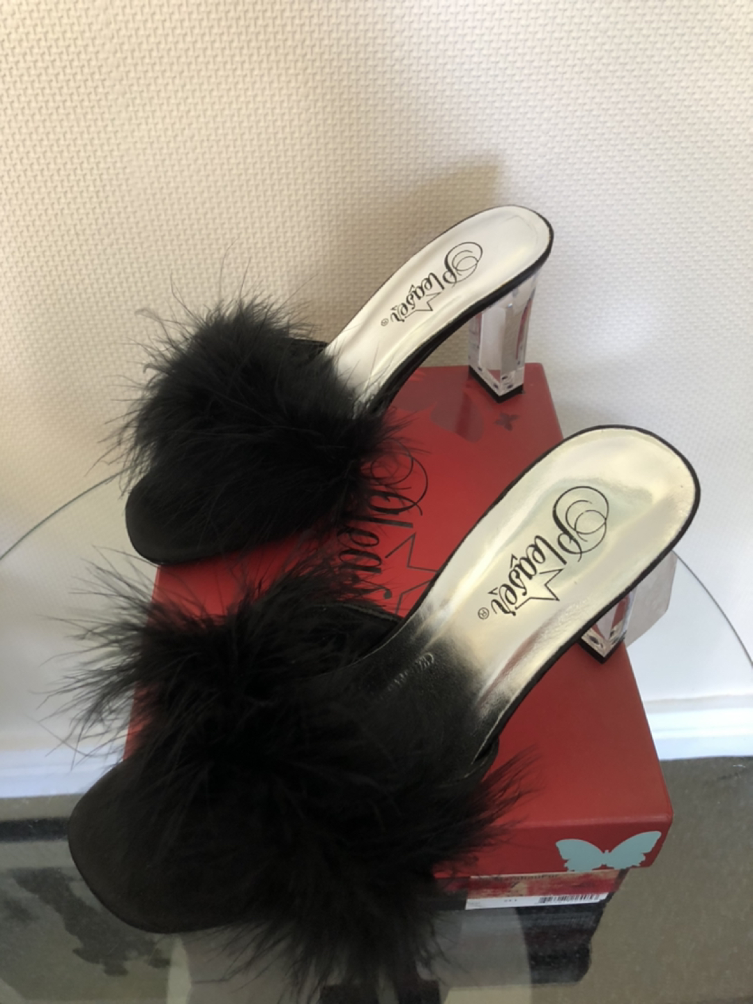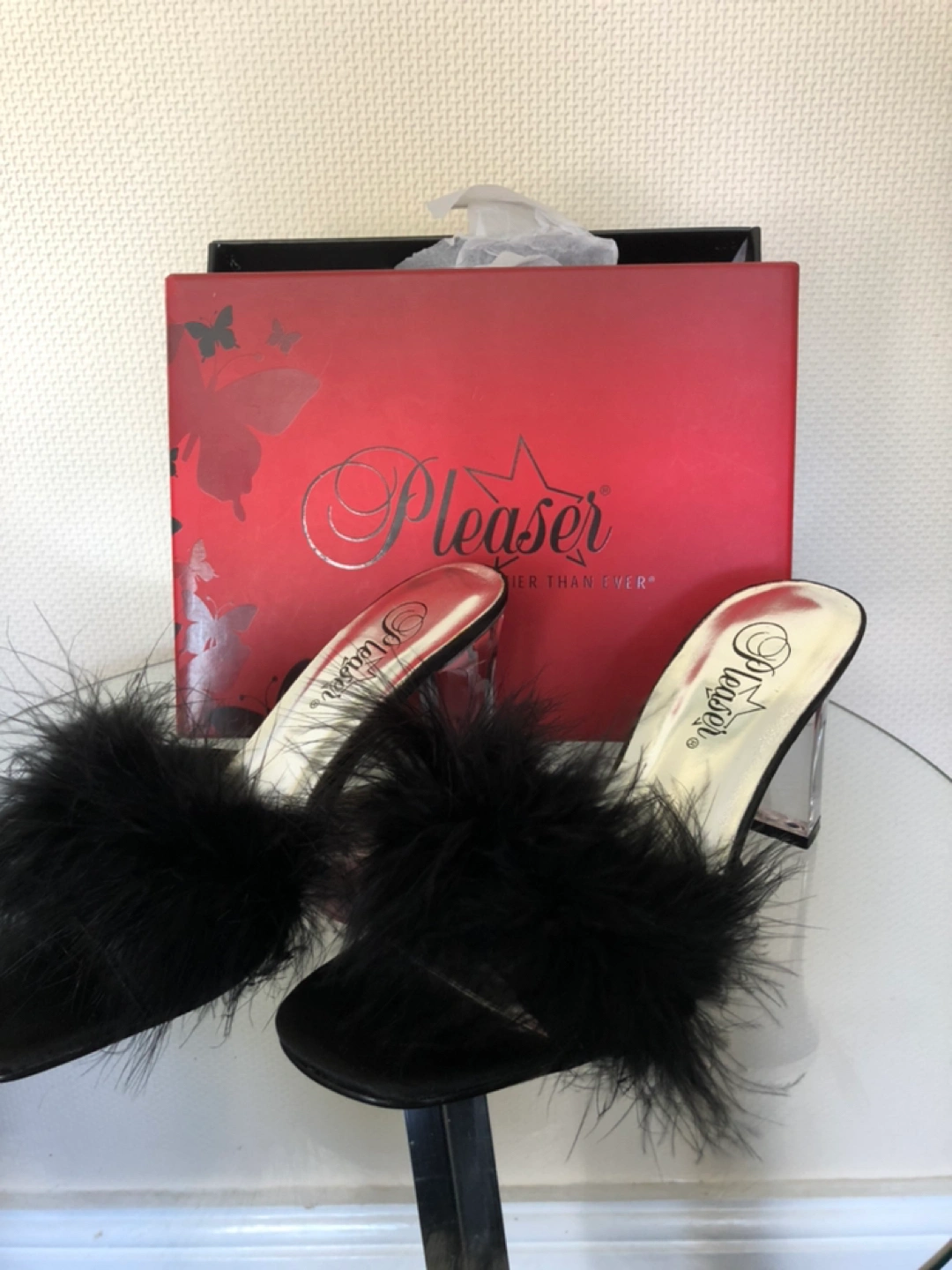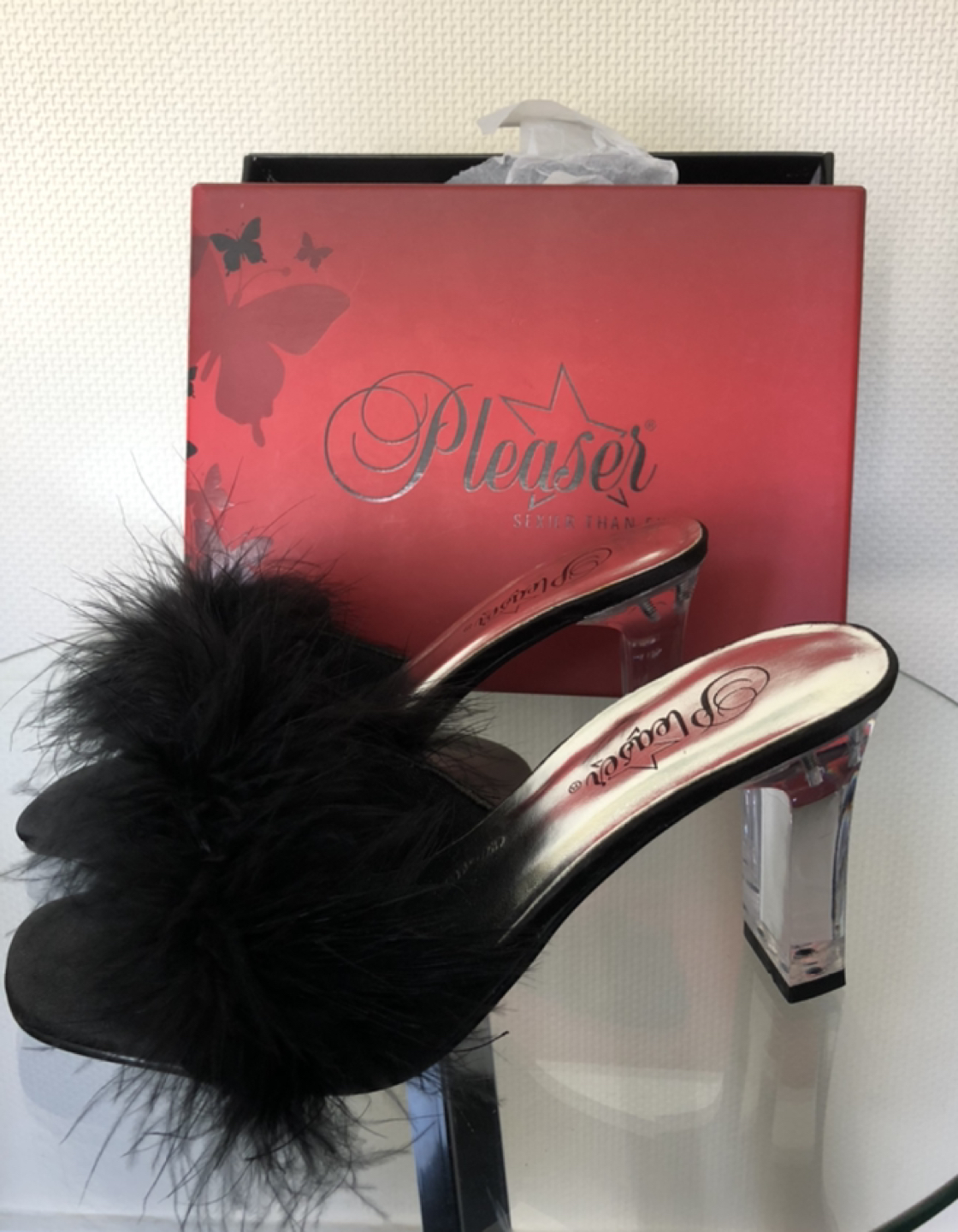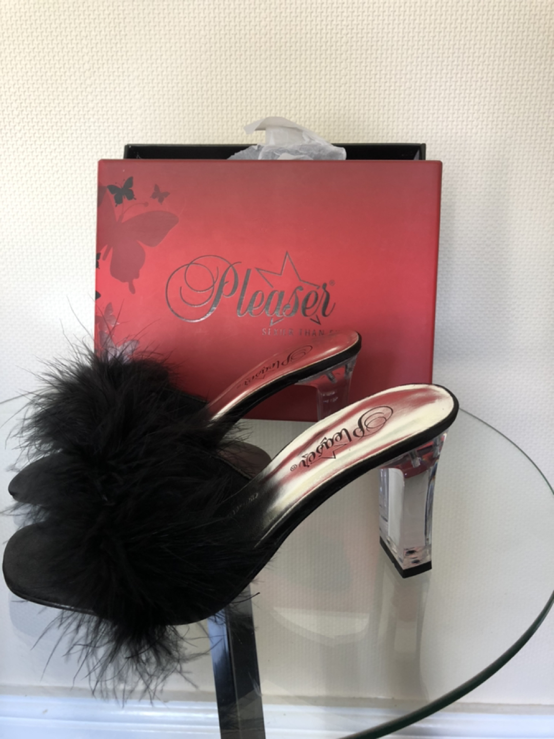 56 reviewsLovely lady shoes, never worn, wrong size, just sat in a box, from pleasure USA, black fluffy mule, transparent heel, size 4 .5, e.u 37.5, pick up or post for a fee.