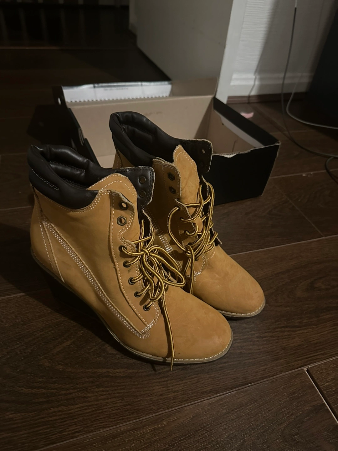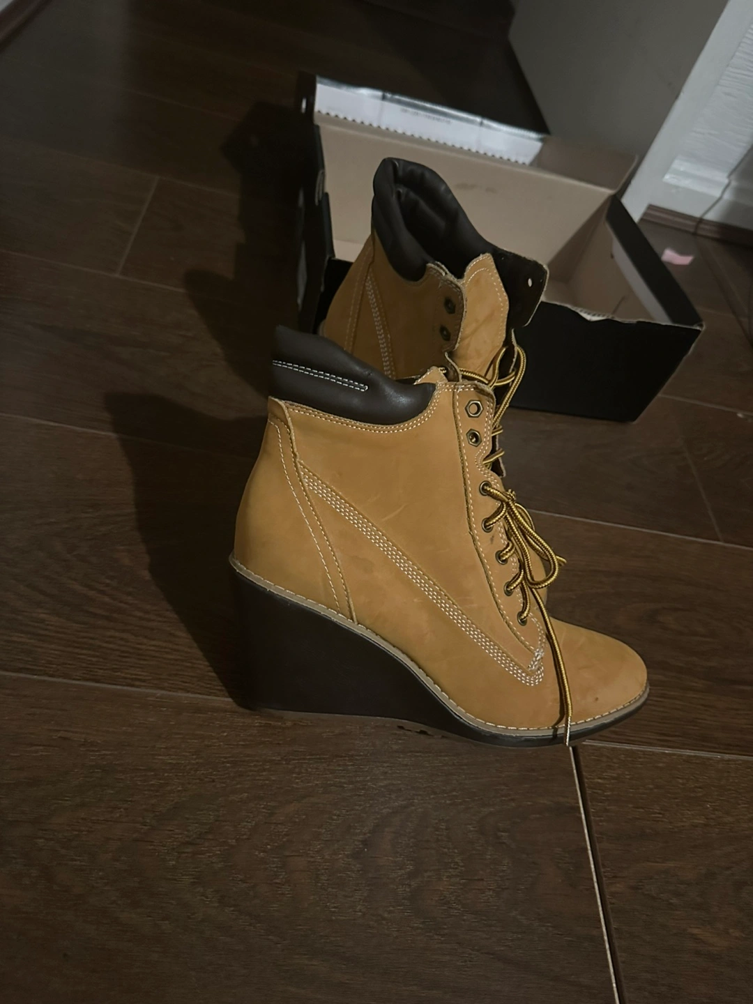 0 reviewsHere are some wedge heel boots in a size 6.5. They are a tan colour and come with the box