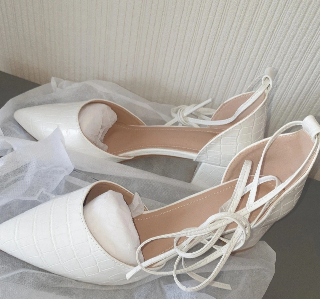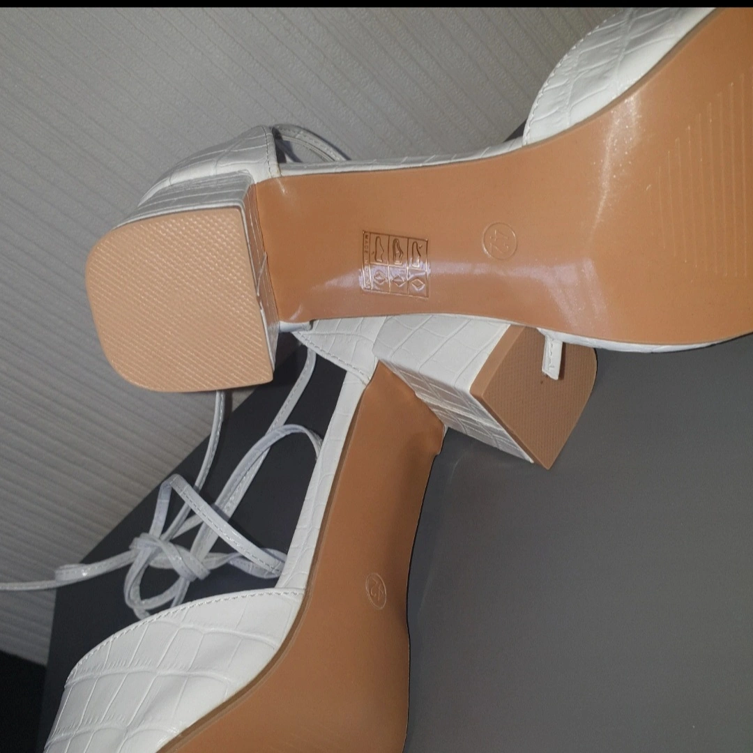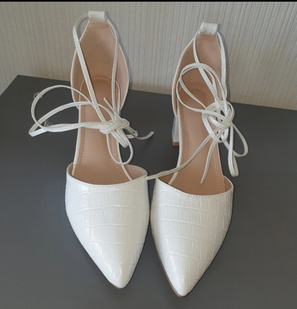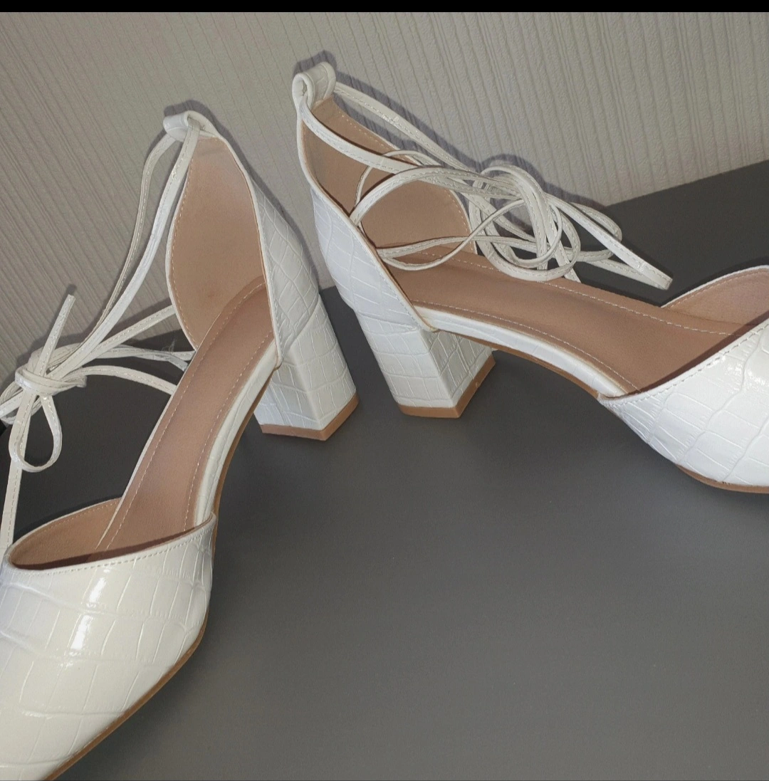 9 reviewsThese are a pair of lovely white heels with a crocodile skin effect. They feature a block heel and tie-up straps. Size 7.5