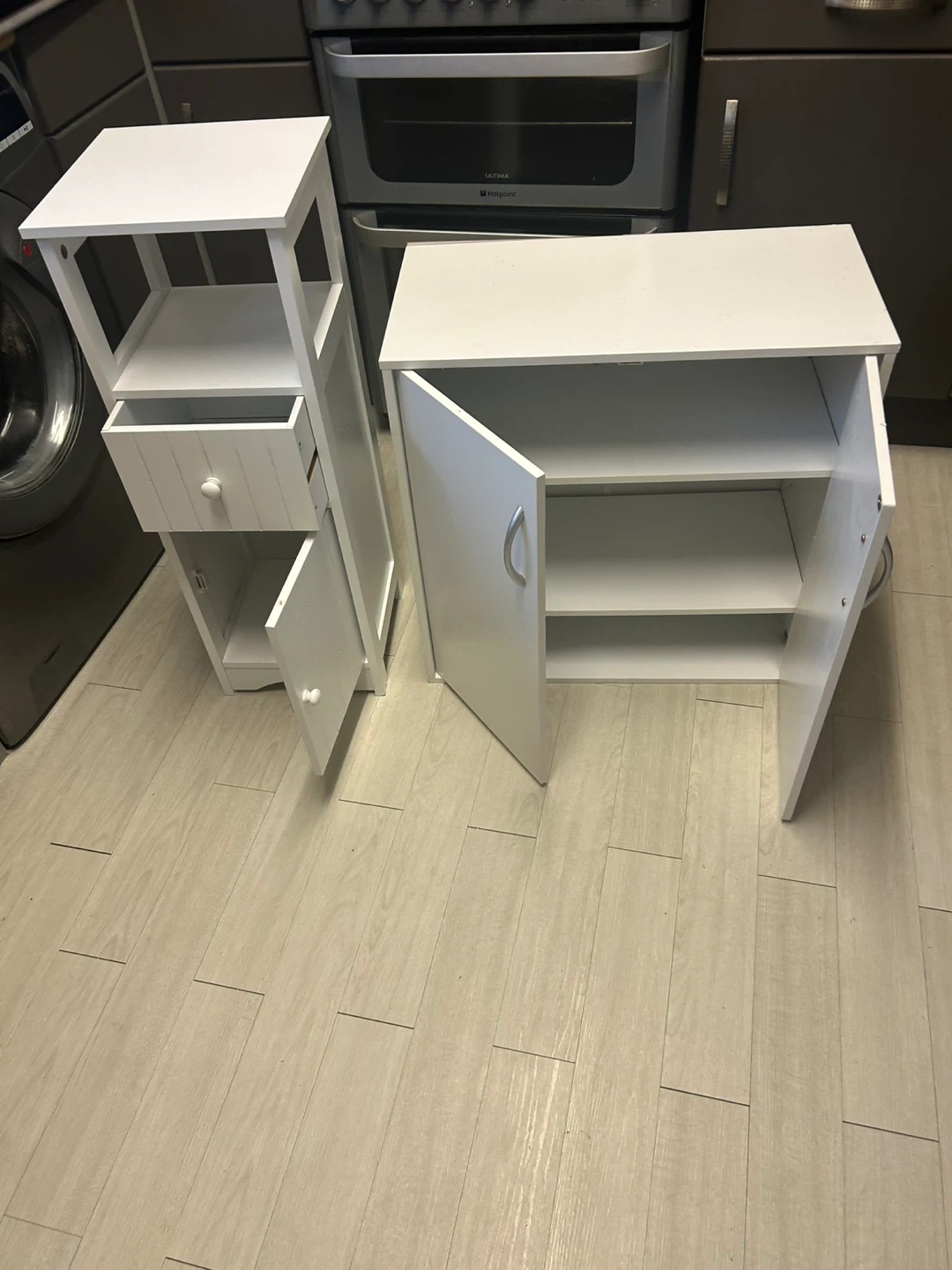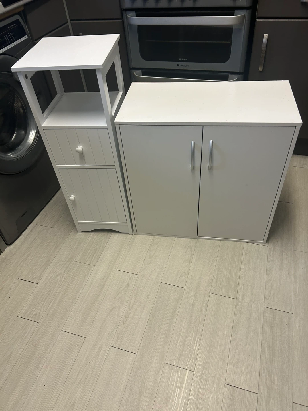 17 reviewsTwo white storage cabinets available. They're in great condition and perfect for adding extra storage to any room. One has shelves and a drawer, while the other has a double door cabinet. They're both sturdy and clean, ready for a new home