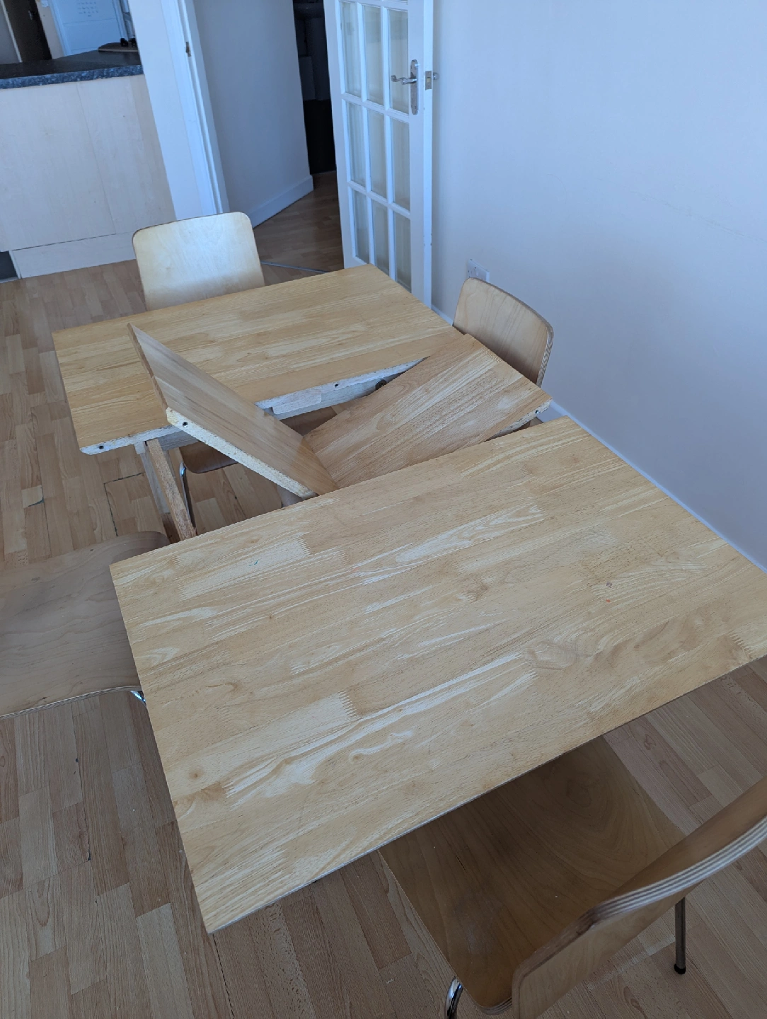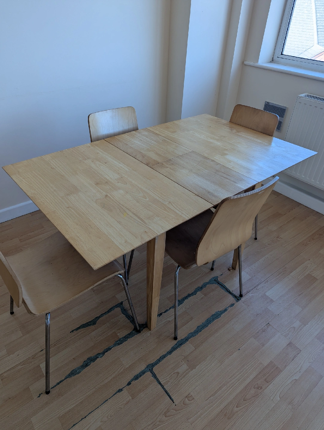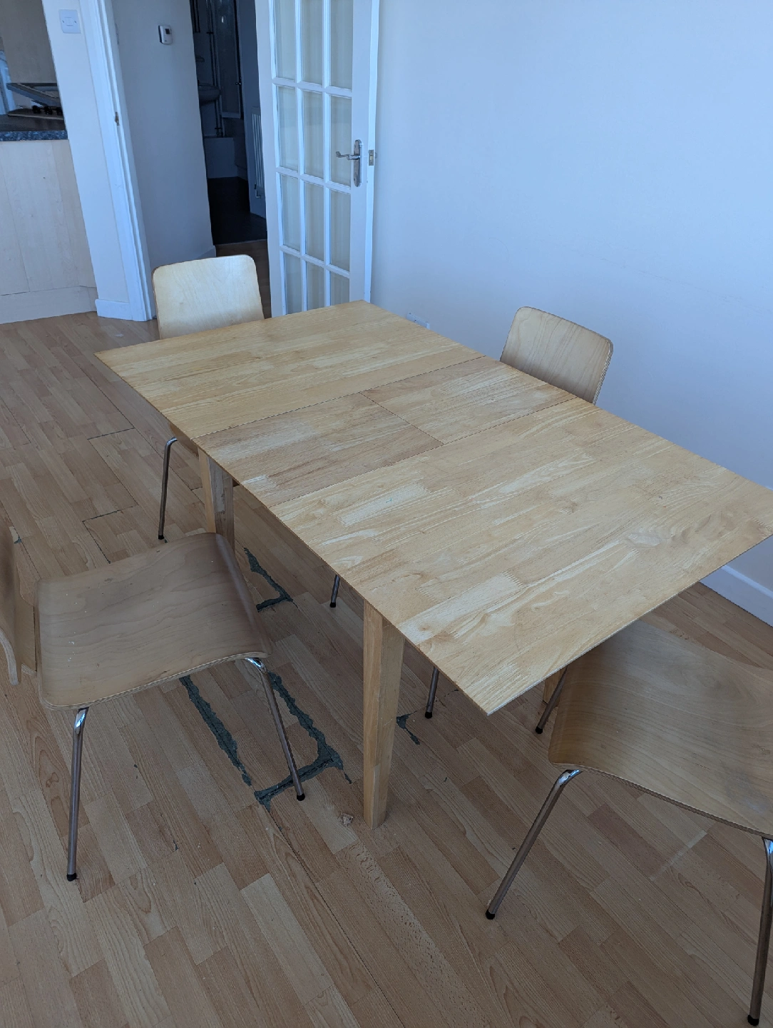 4 reviewsA wooden dining table accompanied by four matching chairs. The table has a light wood finish and a simple, functional design. It looks like it can be extended, as shown in the photos. There are some signs of wear and tear, but it's still perfectly usable for everyday dining. table is extendable with ease. £40 ono, collection only from Harborne.