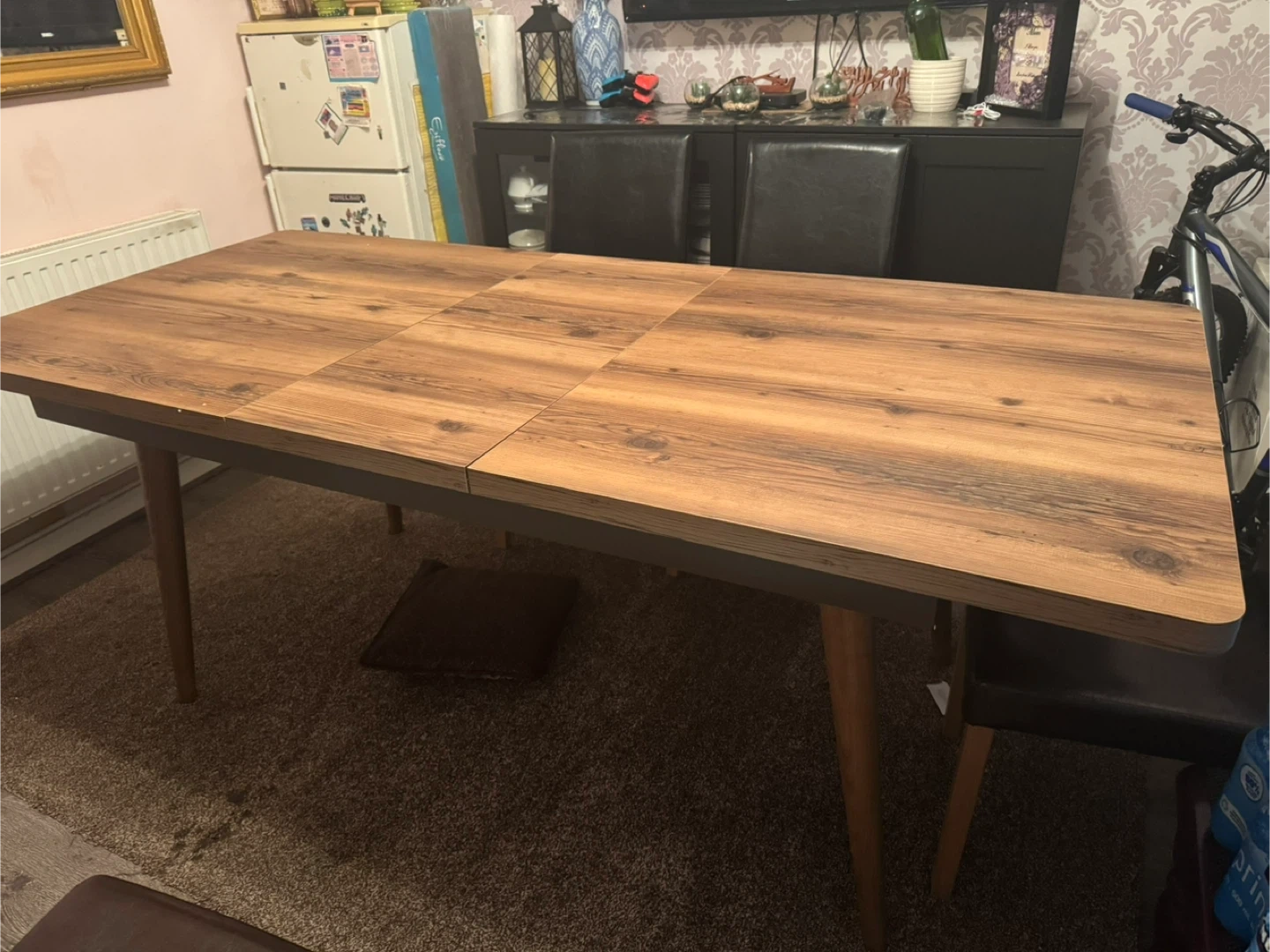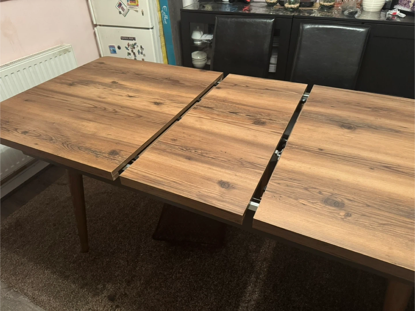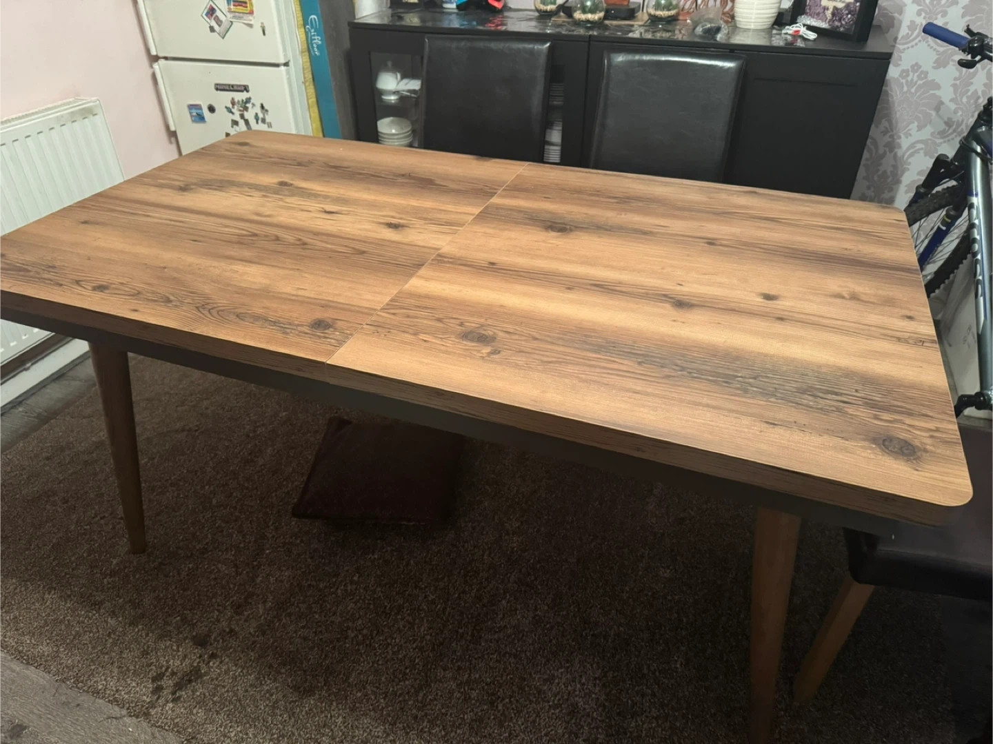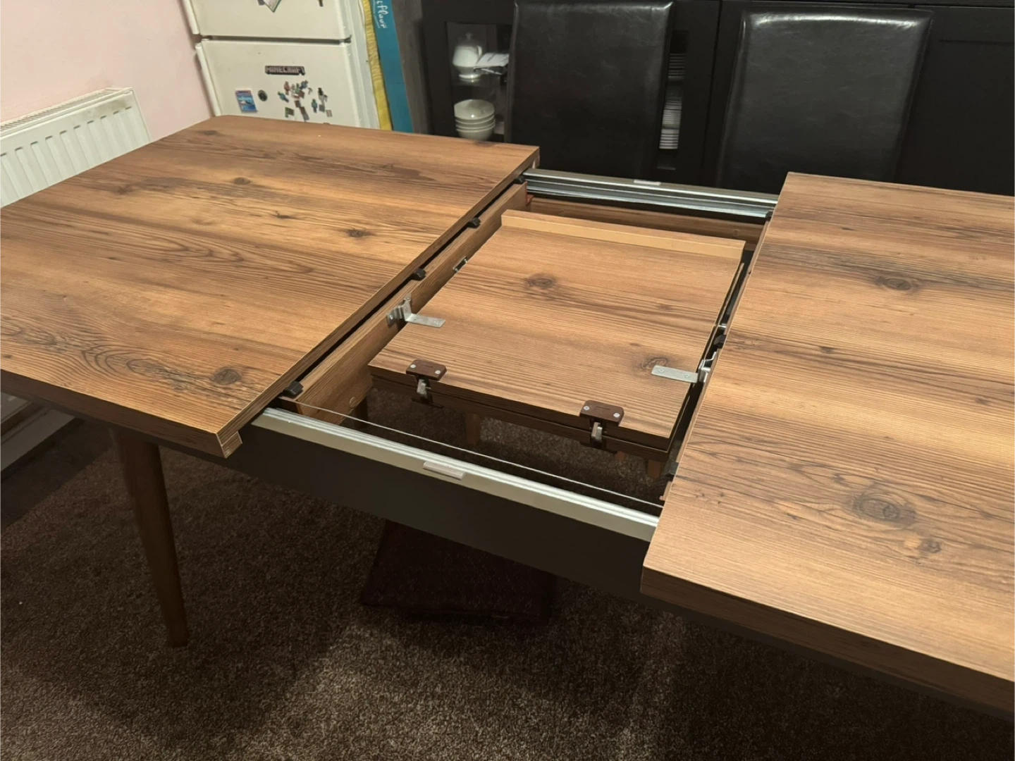 7 reviewsHere's an extendable dining table with a lovely wood finish. It's perfect for when you have extra guests over for dinner. It's in excellent condition and ready for a new home. It has been kept covered with its original packaging so it is like new. It comes with 6 chairs. 2black and 4 brown. All in excellent condition too.