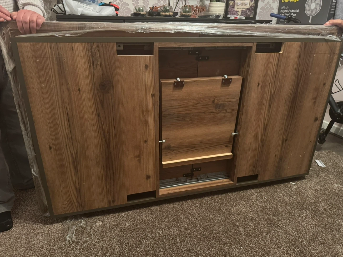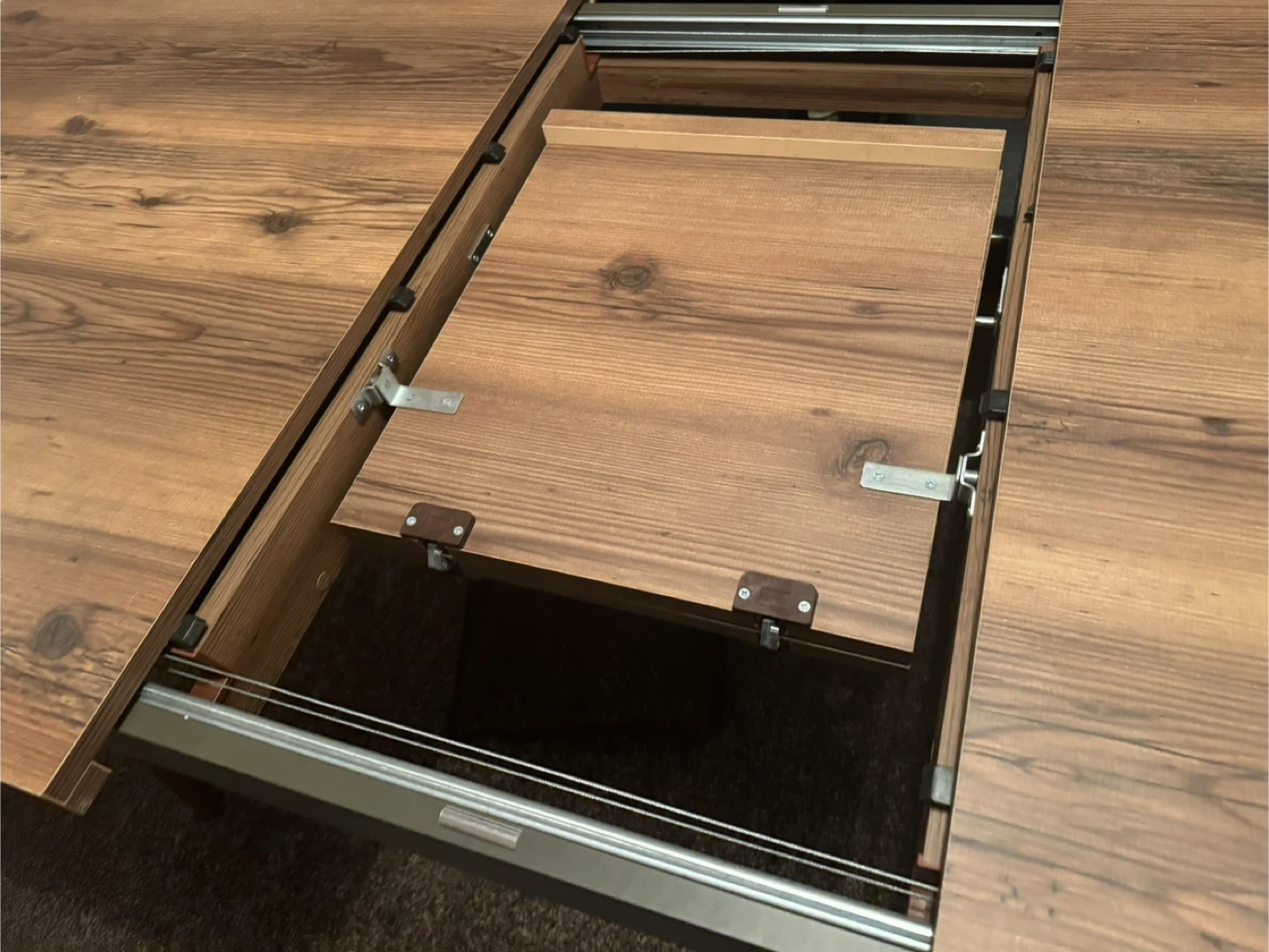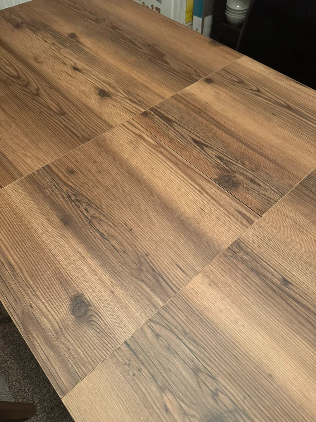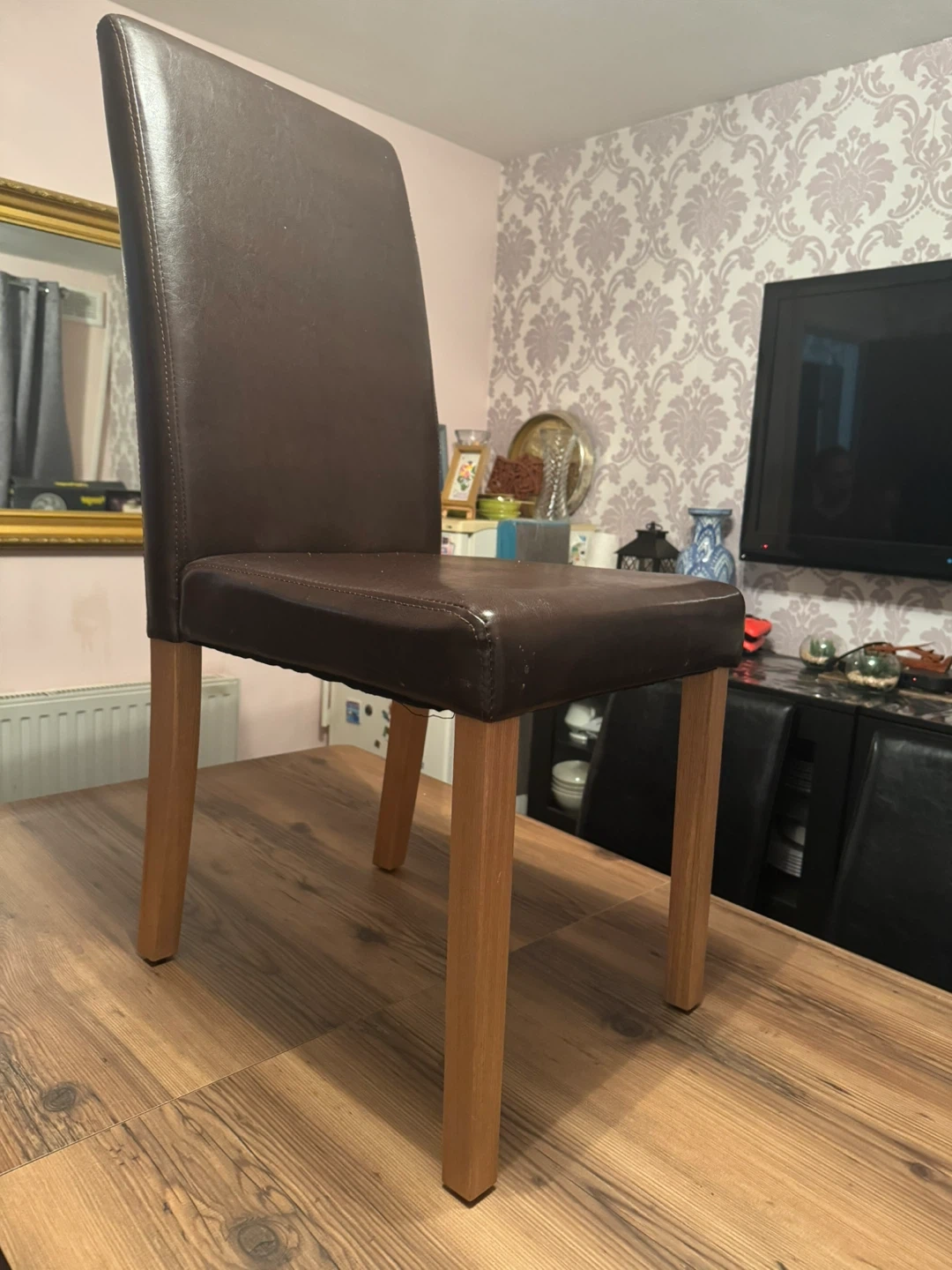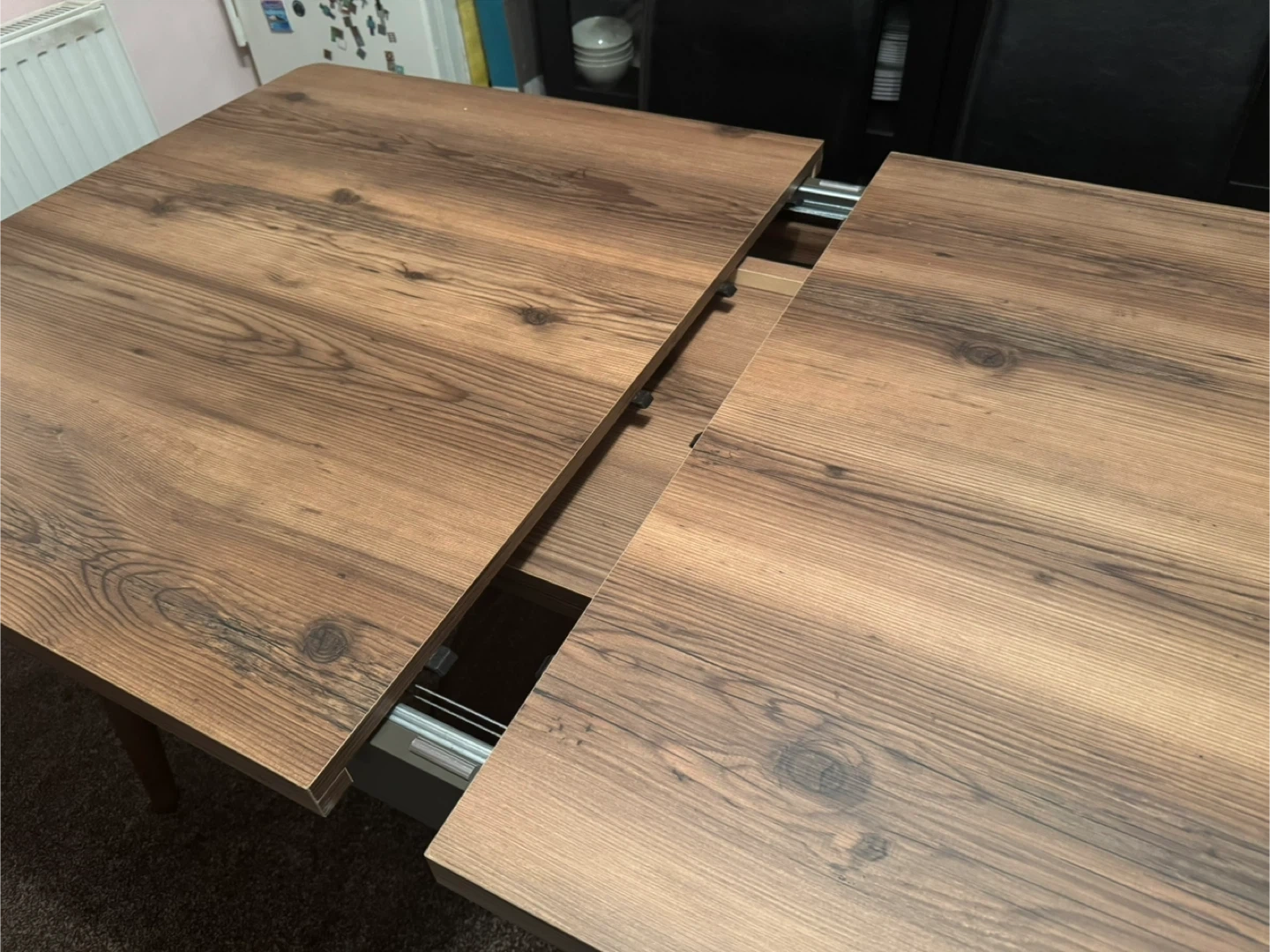 7 reviewsHere's an extendable dining table with a lovely wood finish. It's perfect for when you have extra guests over for dinner. It's in excellent condition and ready for a new home. It has been kept covered with its original packaging so it is like new. It comes with 6 chairs. 2black and 4 brown. All in excellent condition too.