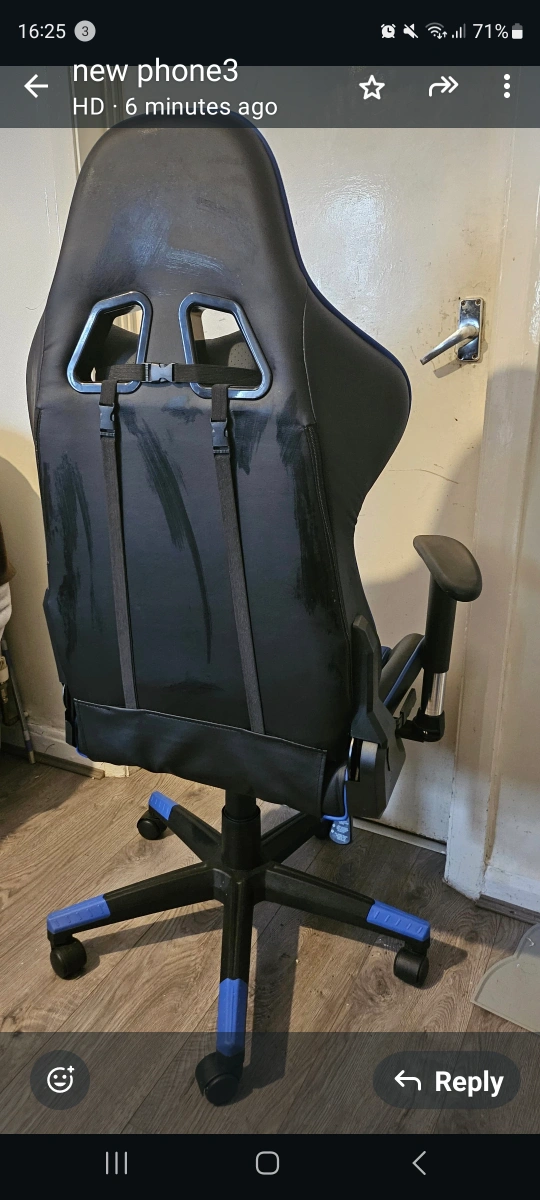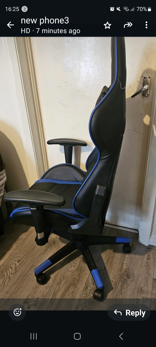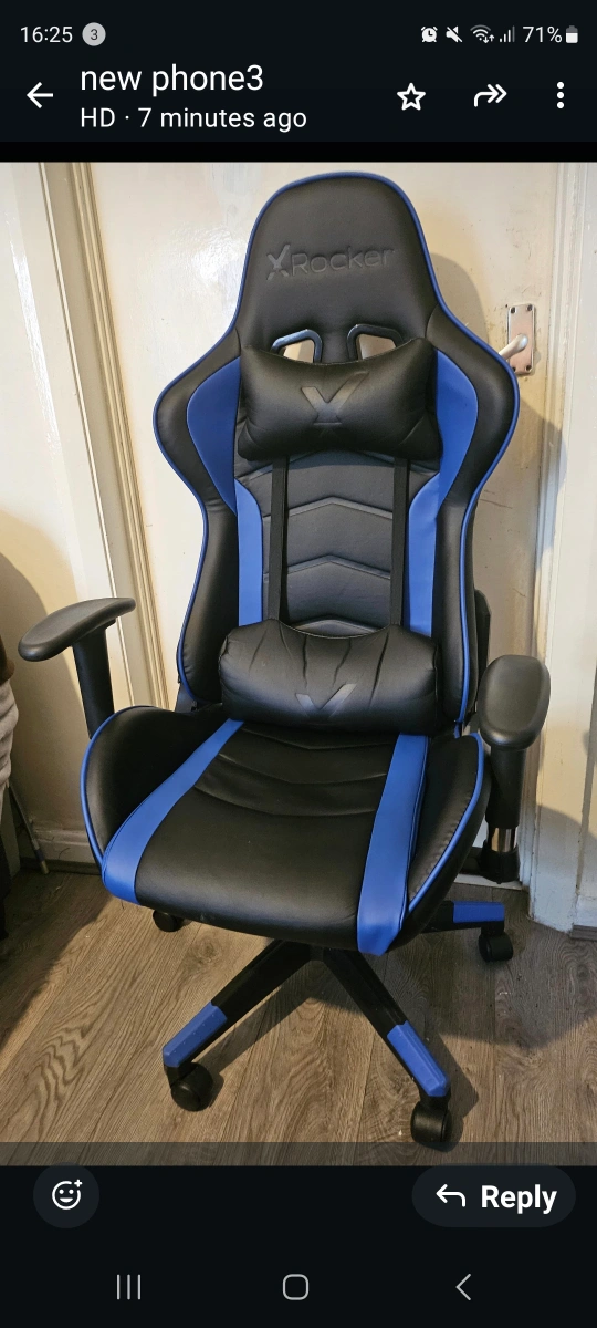 7 reviewsSelling a used X Rocker gaming chair in black and blue. It's in good condition and perfect for gaming or working from home. It has a headrest and lumbar support for extra comfort.There is some gass lift issue other then that all good.