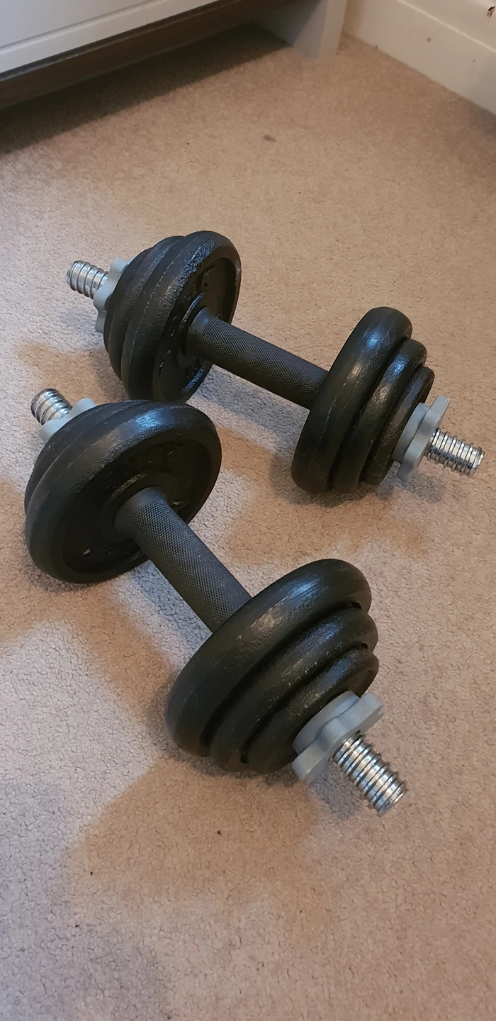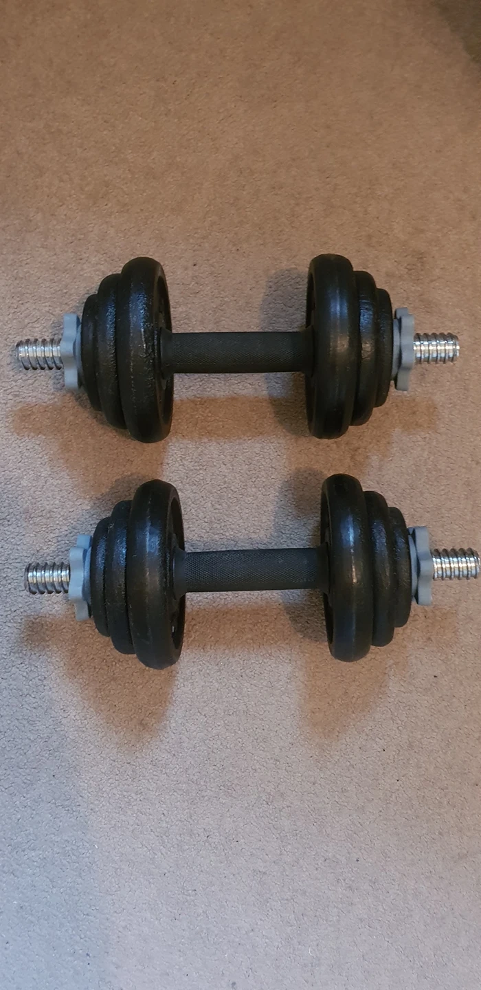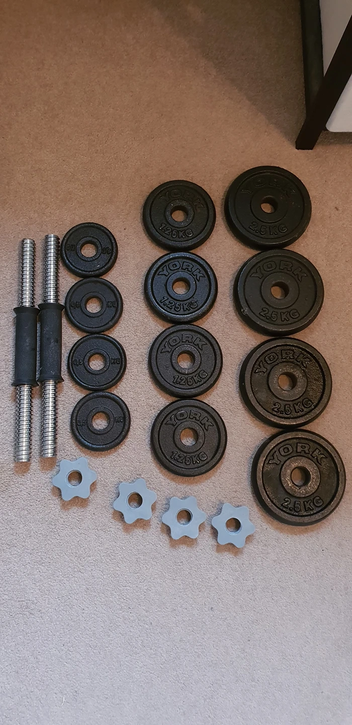 0 reviewsBlack and Chrome YORK dumbbell weights. 17KG weights in total or 8.5KG weights per dumbbell (2.5KG, 1.25KG and 0.5KG weights x4) Easy screw on weights with gripped dumbbell bar and 4 screw caps). In Good condition, collection only from Manchester M22.