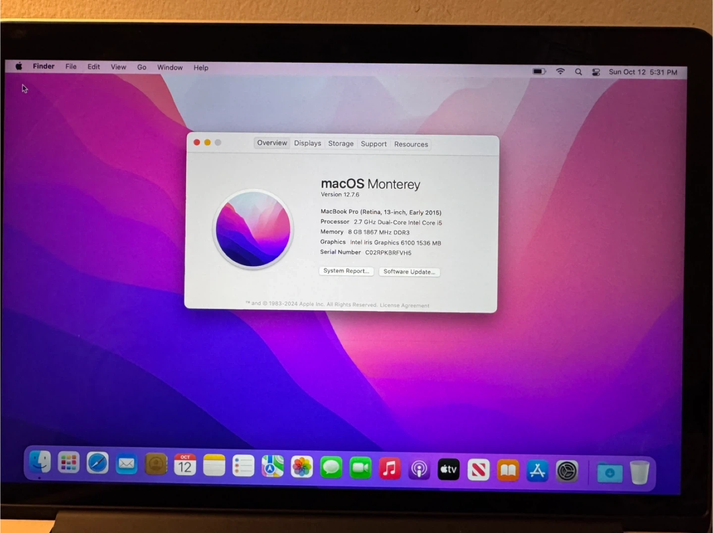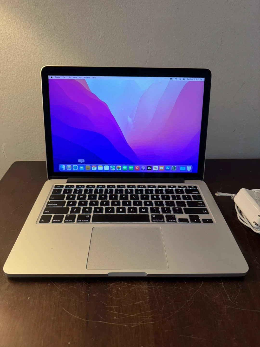 60Selling a MacBook Pro (Retina, 13-inch, Early 2015) in good condition! It has a 13.3-inch Retina display (2560 x 1600) and runs macOS Monterey version 12.7.6. Specs: - Processor: 2.7 GHz Dual-Core Intel Core i5 - Memory: 8 GB 1867 MHz DDR3 - Graphics: Intel Iris Graphics 6100 1536 MB - Storage: 500 GB Flash Storage (477.13 GB available) Serial Number: C02RPK8RFVH5 There are slight imperfections on the screen.