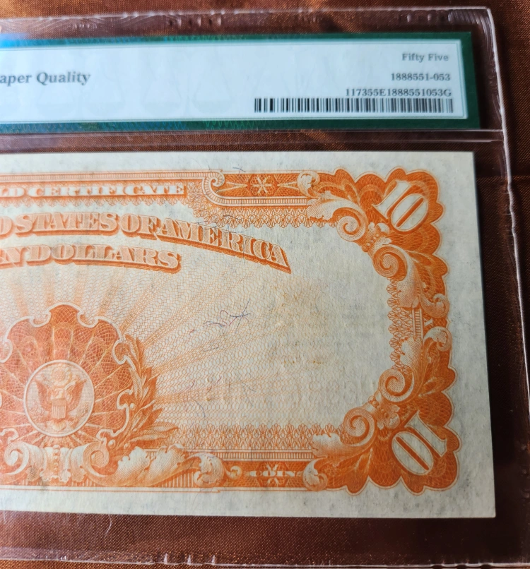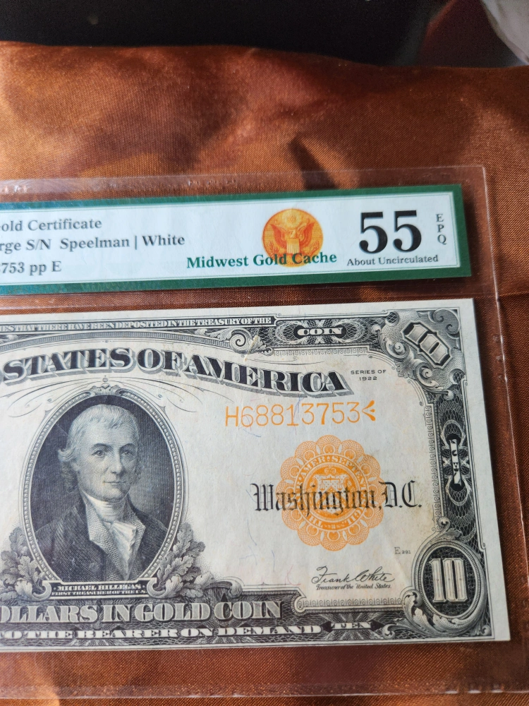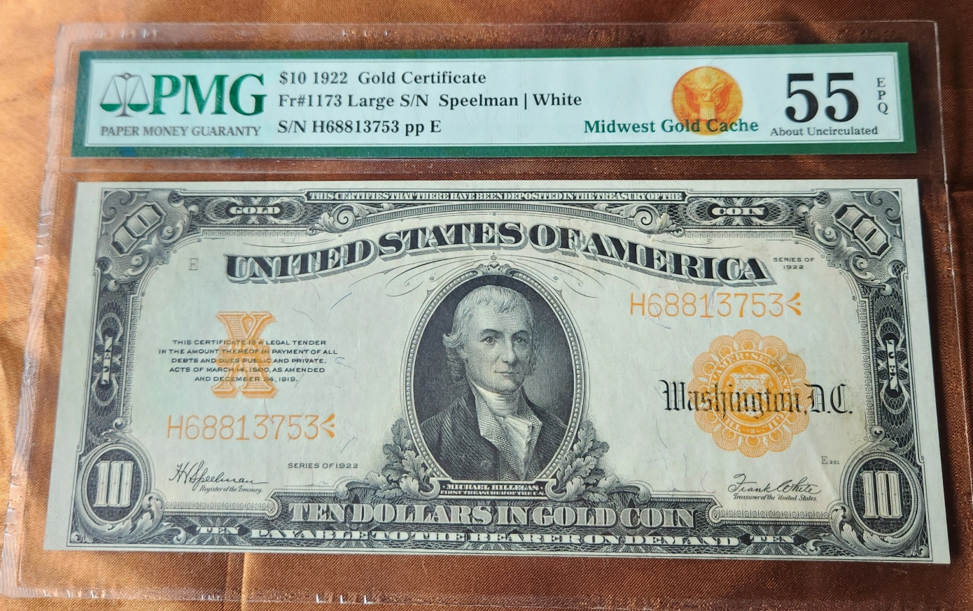 Selling a $10 1922 Gold Certificate. It's graded by PMG as 55 EPQ. The certificate is Fr#1173 Large S/N Speelman | White, with serial number H68813753 pp E.