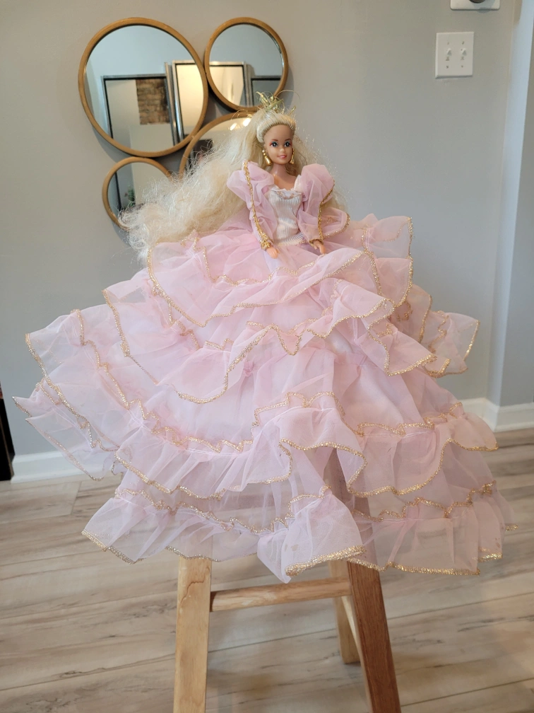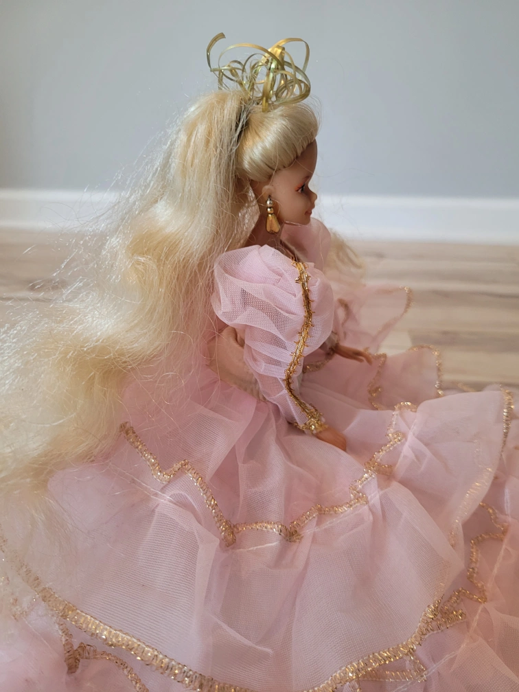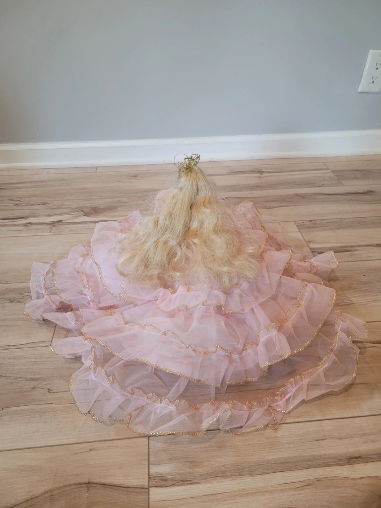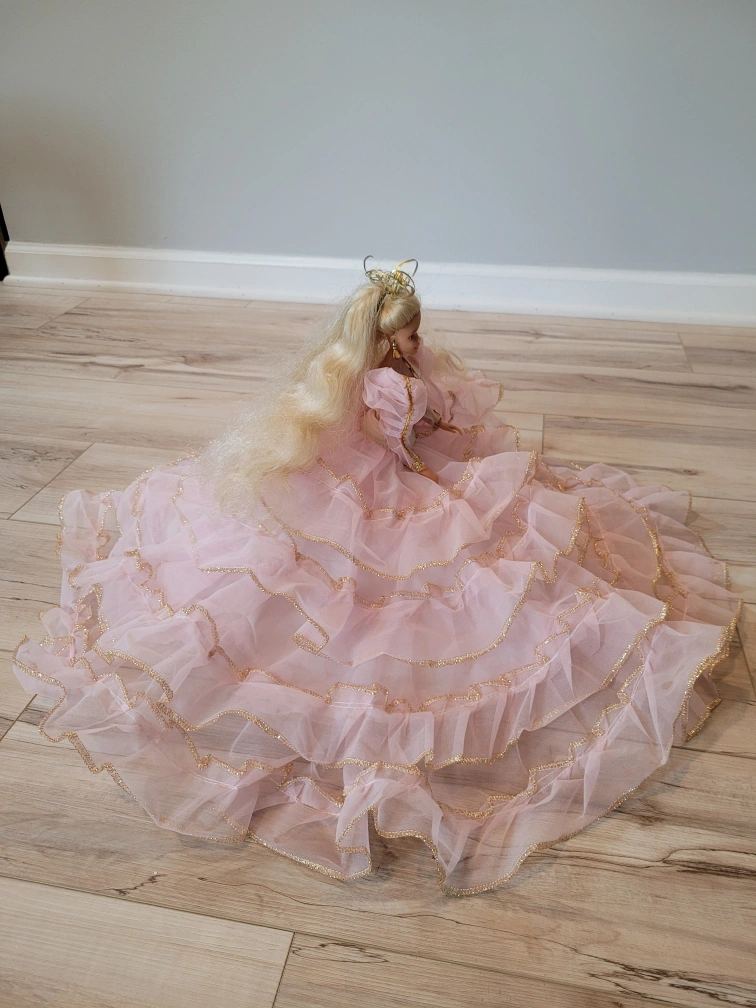 Selling a 10" doll dressed in a glamorous pink gown with gold accents and many ruffles. It's in good condition just some blemish marks on the dress throughout not very noticeable see close-up photo. Doll is wearing leggings underneath and hoop skirt to make the skirt poof out. No doll stand included. Feel free to check out my other unique items listed.