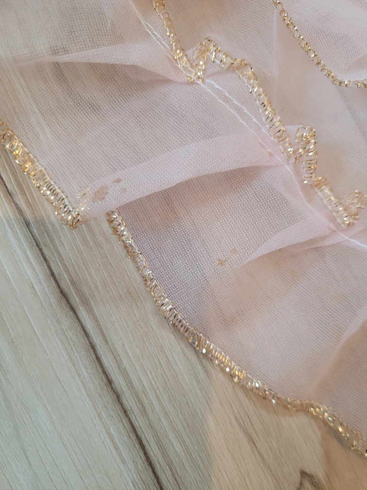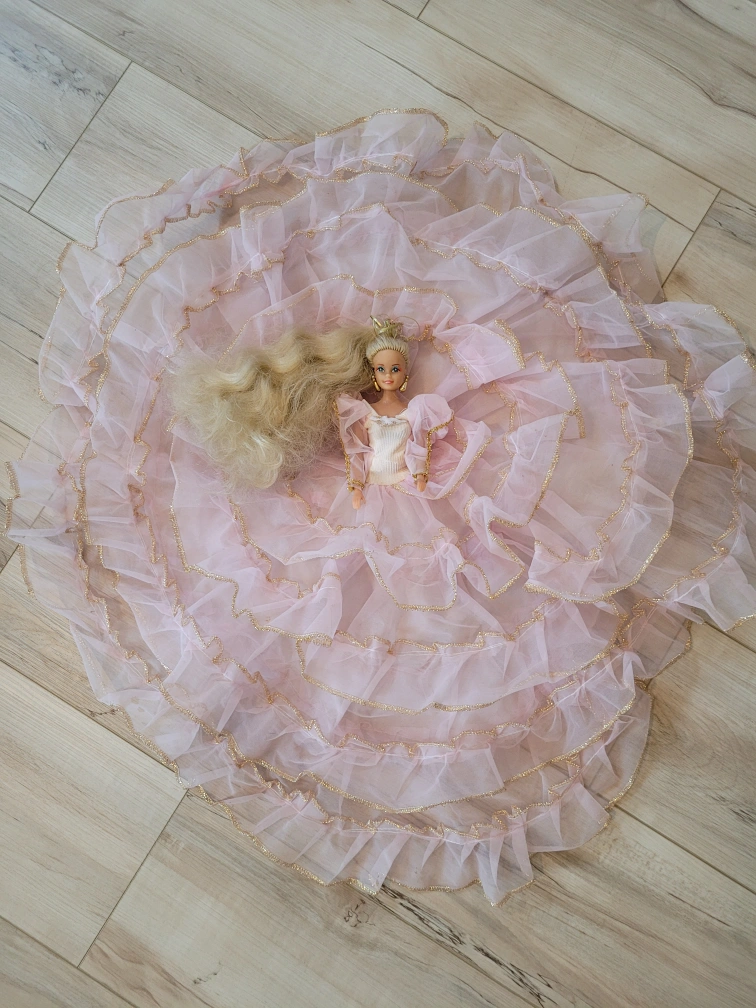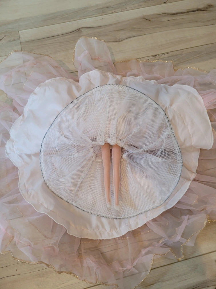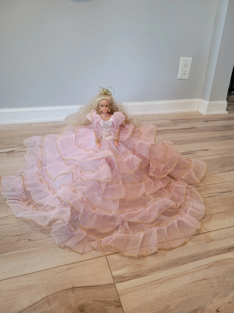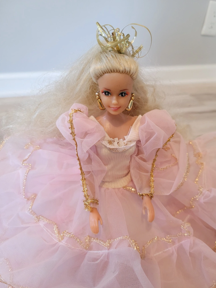 Selling a 10" doll dressed in a glamorous pink gown with gold accents and many ruffles. It's in good condition just some blemish marks on the dress throughout not very noticeable see close-up photo. Doll is wearing leggings underneath and hoop skirt to make the skirt poof out. No doll stand included. Feel free to check out my other unique items listed.