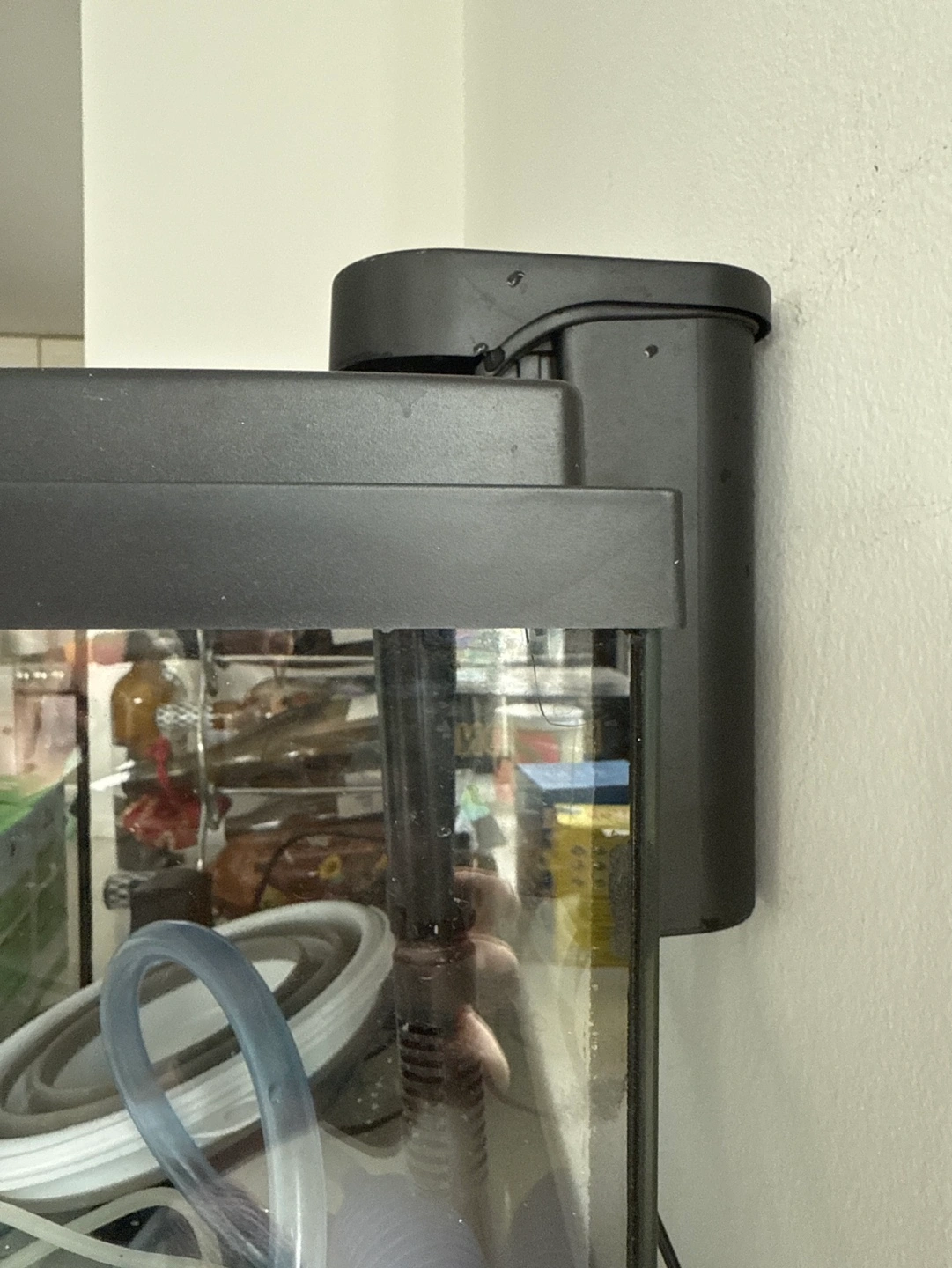10 gallon glass fish tank includes water heater, filter, thermometer, air pump, air pump replacement stones, collapsable bucket, 3 packs of Terra Whisper Bio-Bag Filter Cartridges, two no more algae tablets, and two top fin fish food containers. Glass is slightly cracked at the top of the tank but does not affect the functionality of the tank. LED lights are dim.