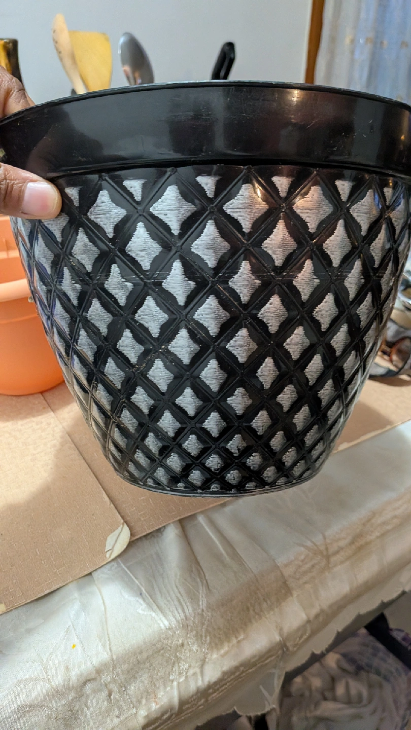 1000+Giving away a 10 inch Planter Jardiniere. It has a black and silver color with a diamond pattern. It is in used condition, with some dirt inside. Just needs to be washed!